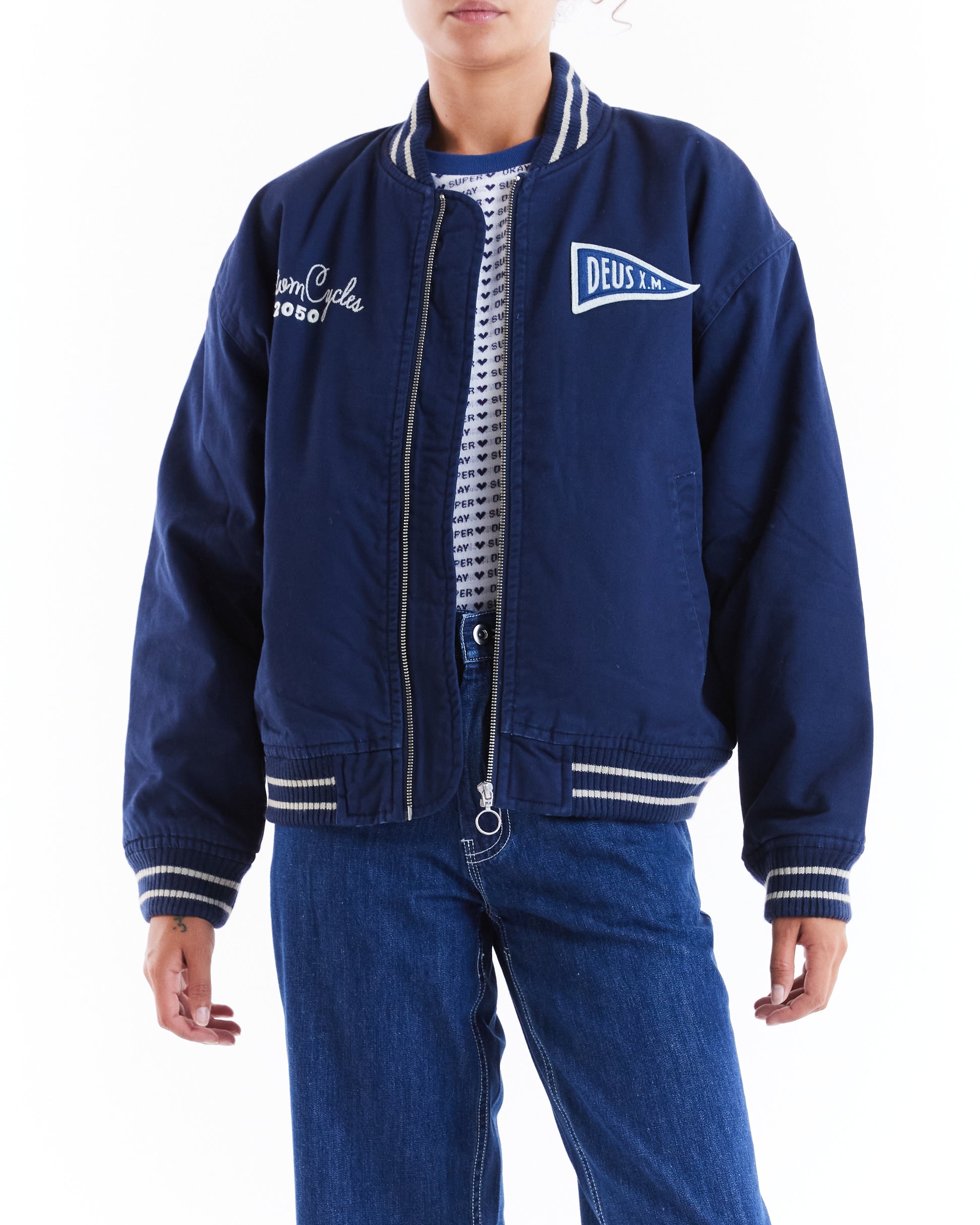 Relaxed Fit Bomber Jacket With Striped Ribbed Collar,Cuffs And Hem, Embroidery And Felt Applique Art At Front And Back, Lower Slash Pockets And Centre Front Zip, Cotton Twill Outer Shell, Recycled Nylon Lining And 3m Thinsulate Wadding Fabrication With A Heavy Garment Wash