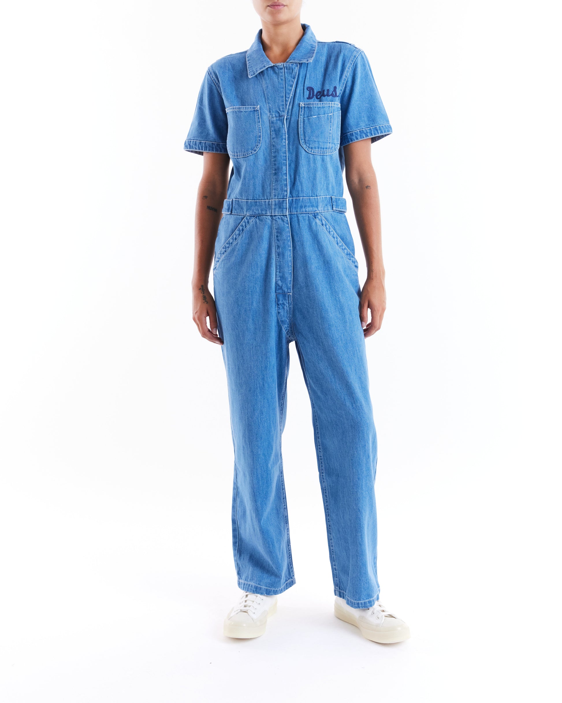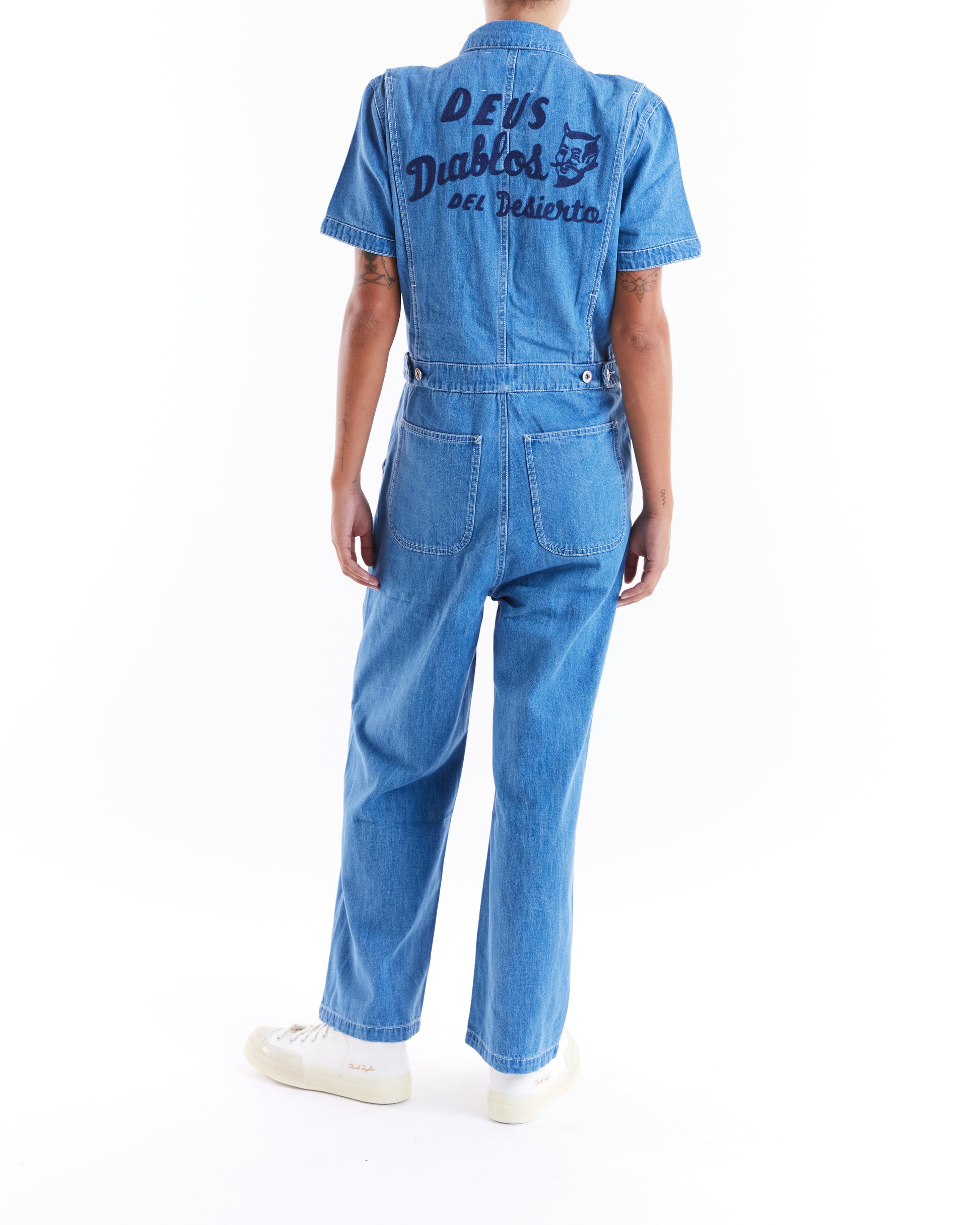 Relaxed Fit Short Sleeve Overall With Embroidered Chain Stitch Art At Front Chest And Back, Lower Front Slash, Front And Back Patch Pockets, Metal Shank Button Centre Front Closure Ad Side Adjusters, In A Cotton Twill Fabrication With A Heavy Enzyme Bleach Stone Wash