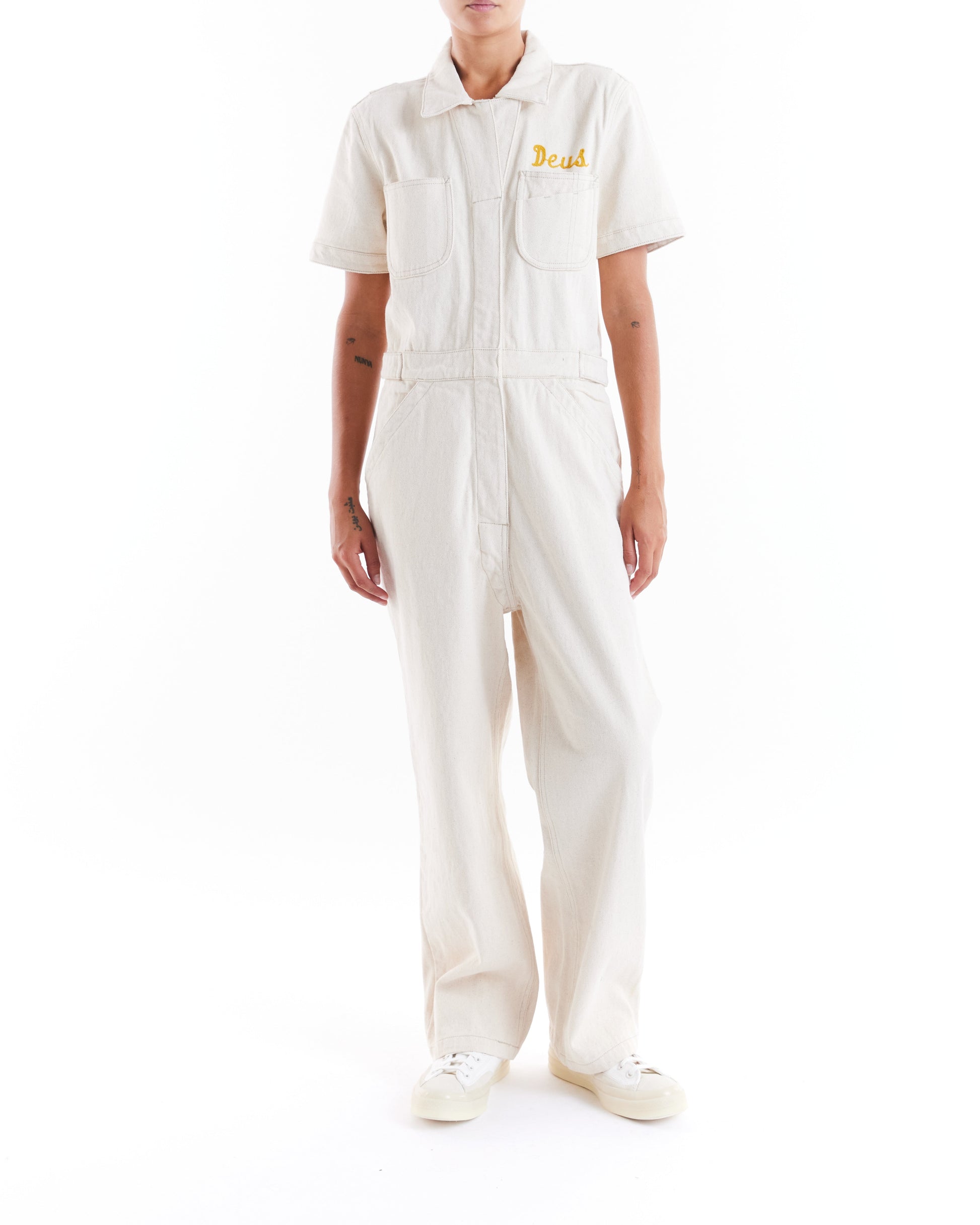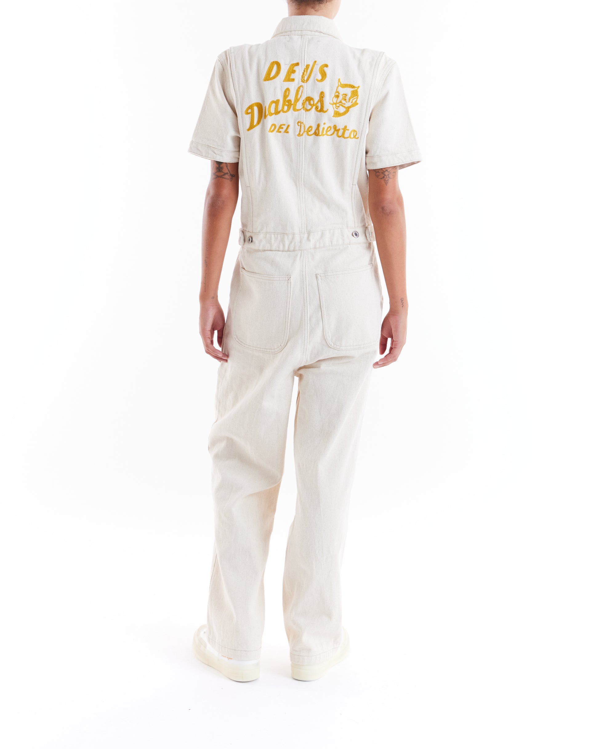 Relaxed Fit Short Sleeve Overall With Embroidered Chain Stitch Art At Front Chest And Back, Lower Front Slash, Front And Back Patch Pockets, Metal Shank Button Centre Front Closure Ad Side Adjusters, In A Cotton Twill Fabrication With A Heavy Enzyme Bleach Stone Wash