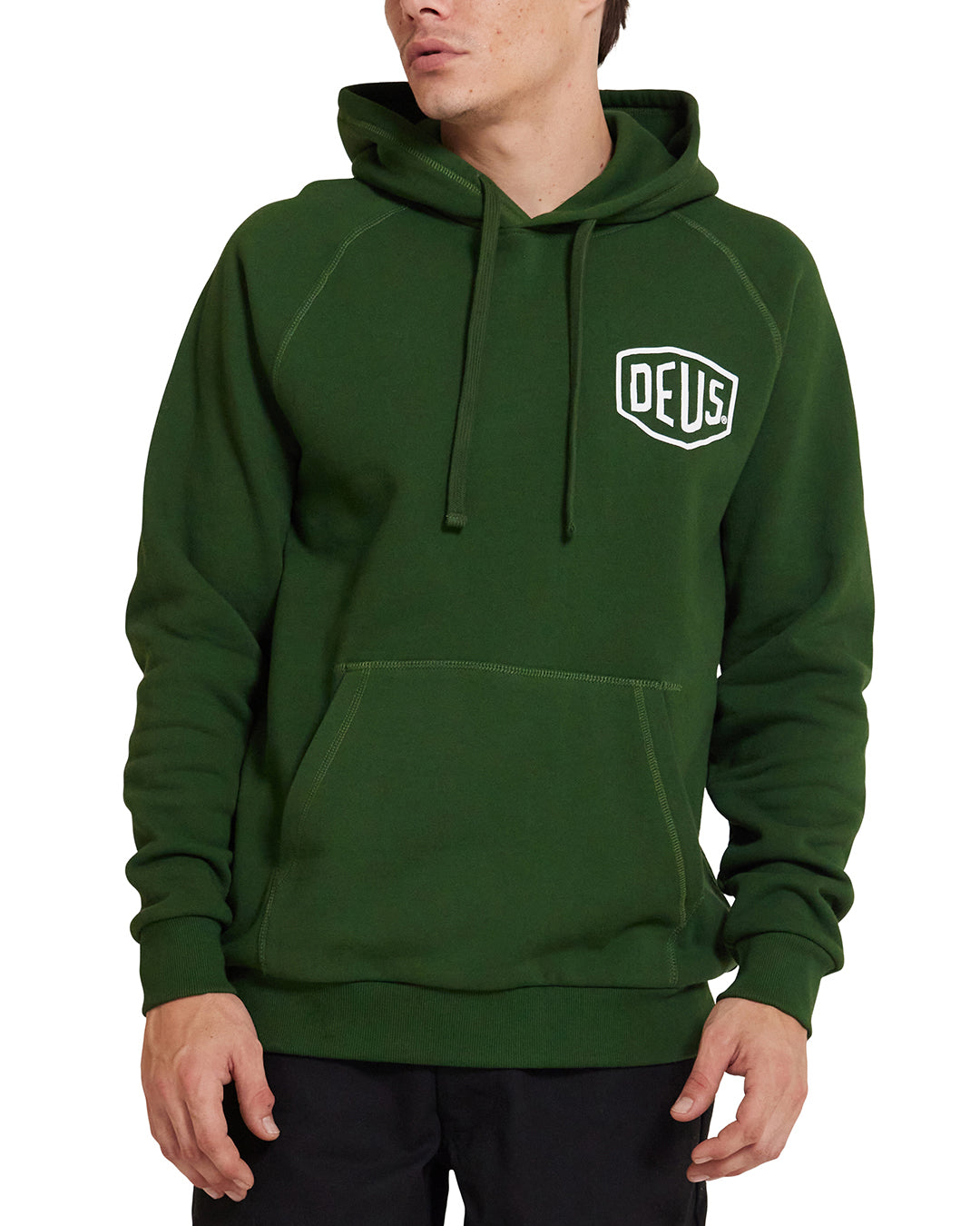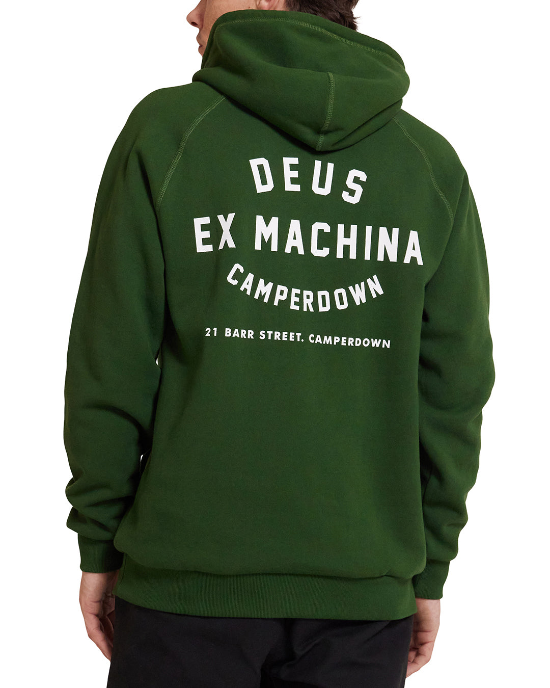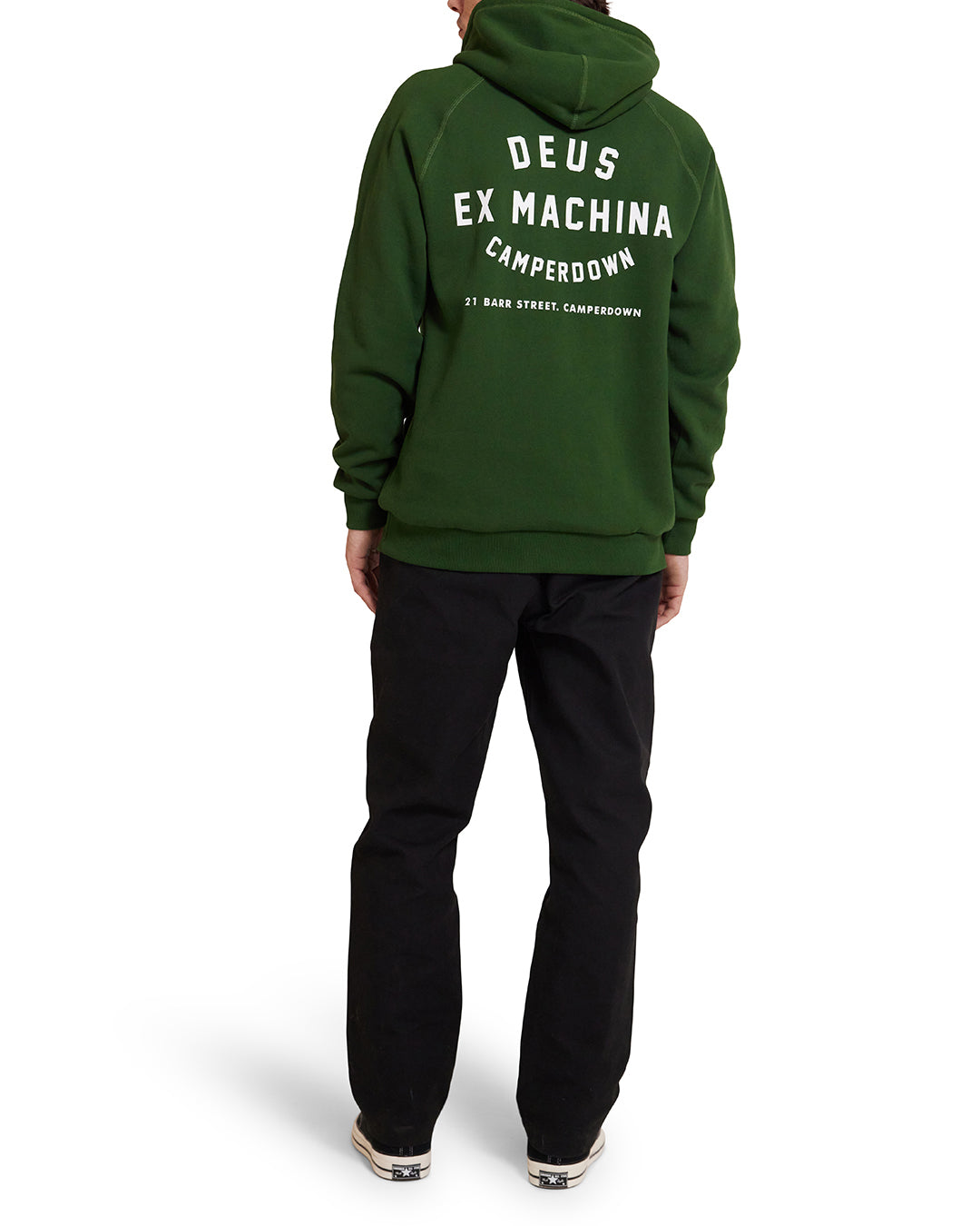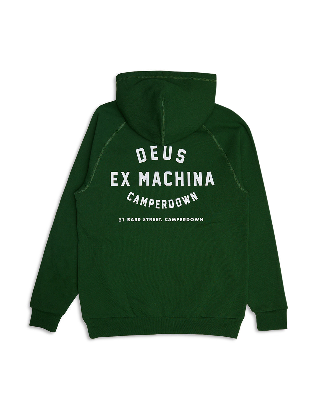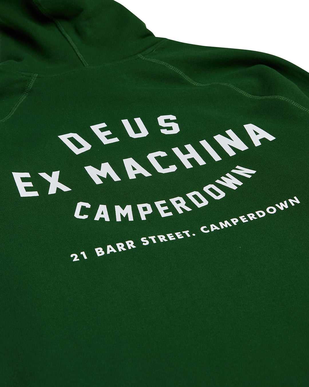 Regular Fit Classic Address Print Raglan Hoodie. Organic Cotton 380gsm. Brushed Back Fleece Fabrication With A Garment Wash