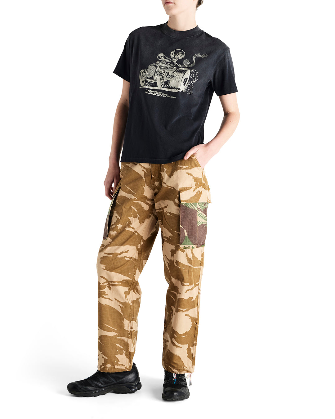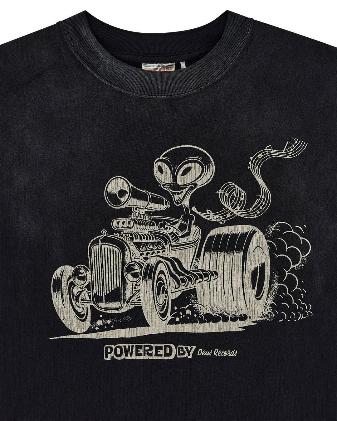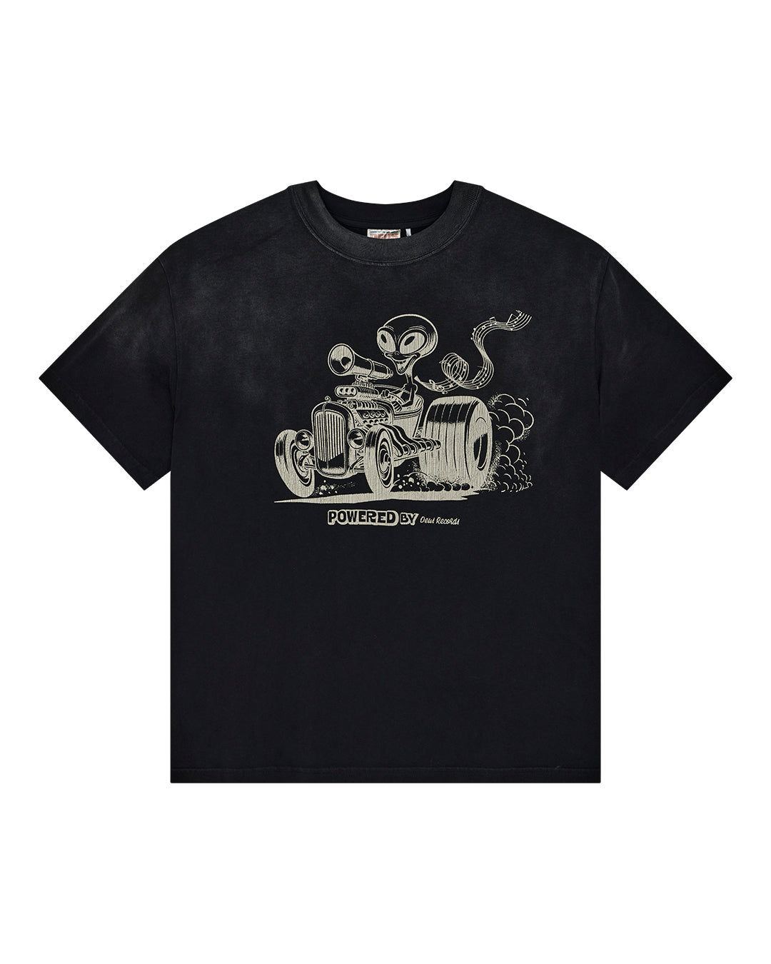 Vintage fit (cropped) short sleeve t-shirt with chest and back placement art, in a recycled cotton jersey fabrication, pigment dyed with a heavy enzyme stone wash with localised vintage fade effect.