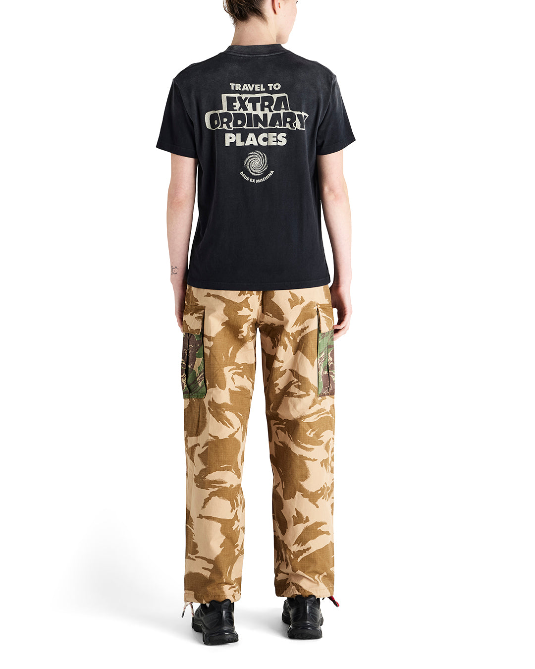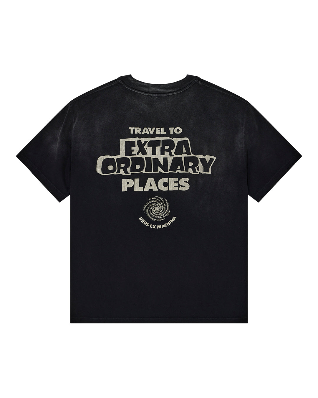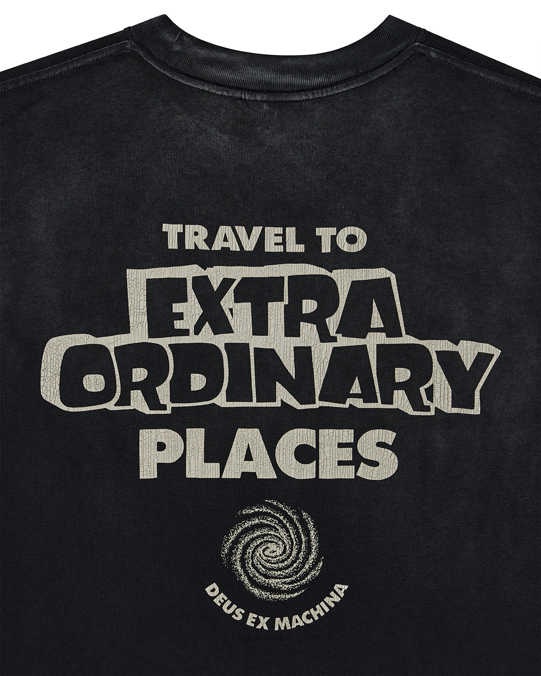 Vintage fit (cropped) short sleeve t-shirt with chest and back placement art, in a recycled cotton jersey fabrication, pigment dyed with a heavy enzyme stone wash with localised vintage fade effect.