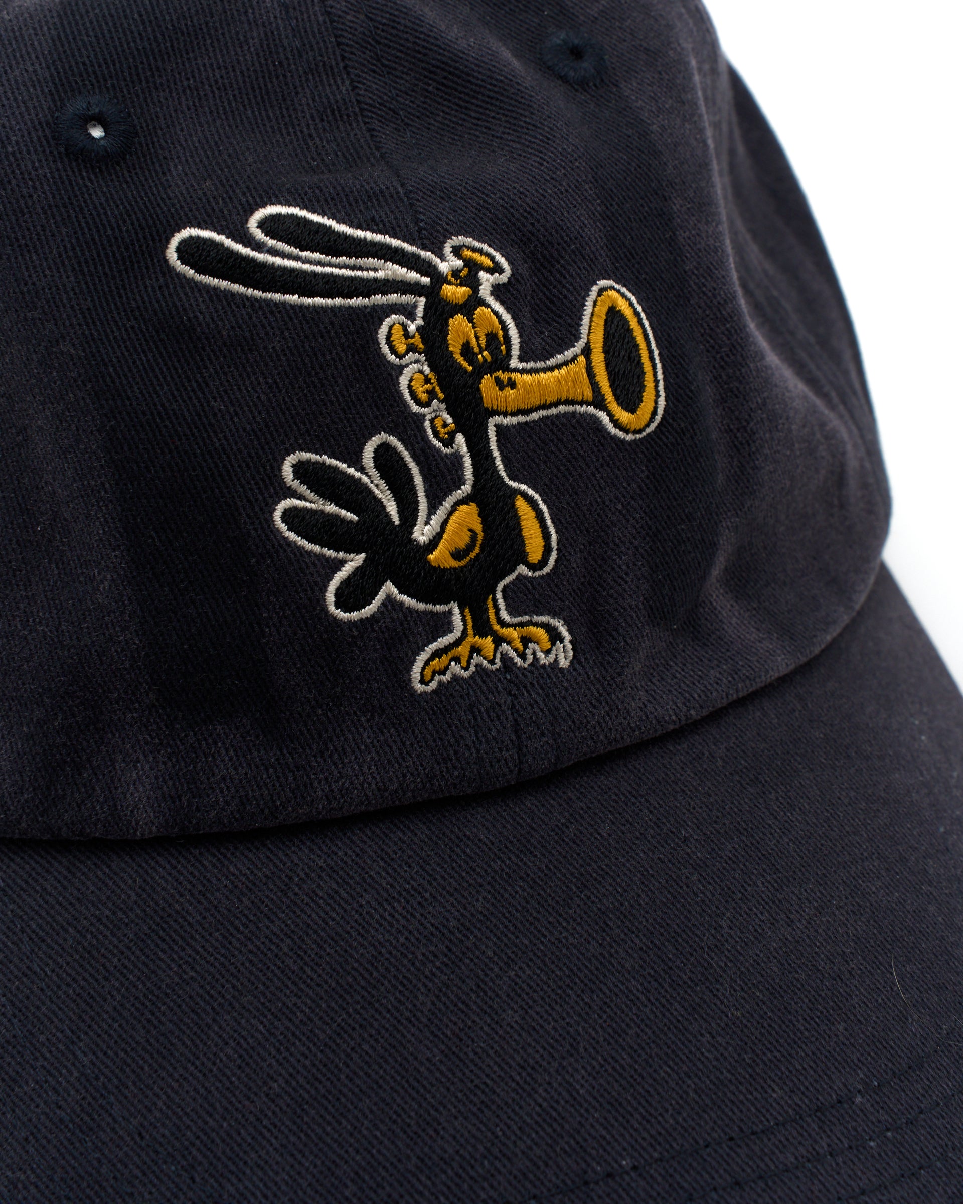 Baseball trucker with front and back embroidered artwork, in a cotton twill fabrication with a heavy enzyme stone wash.