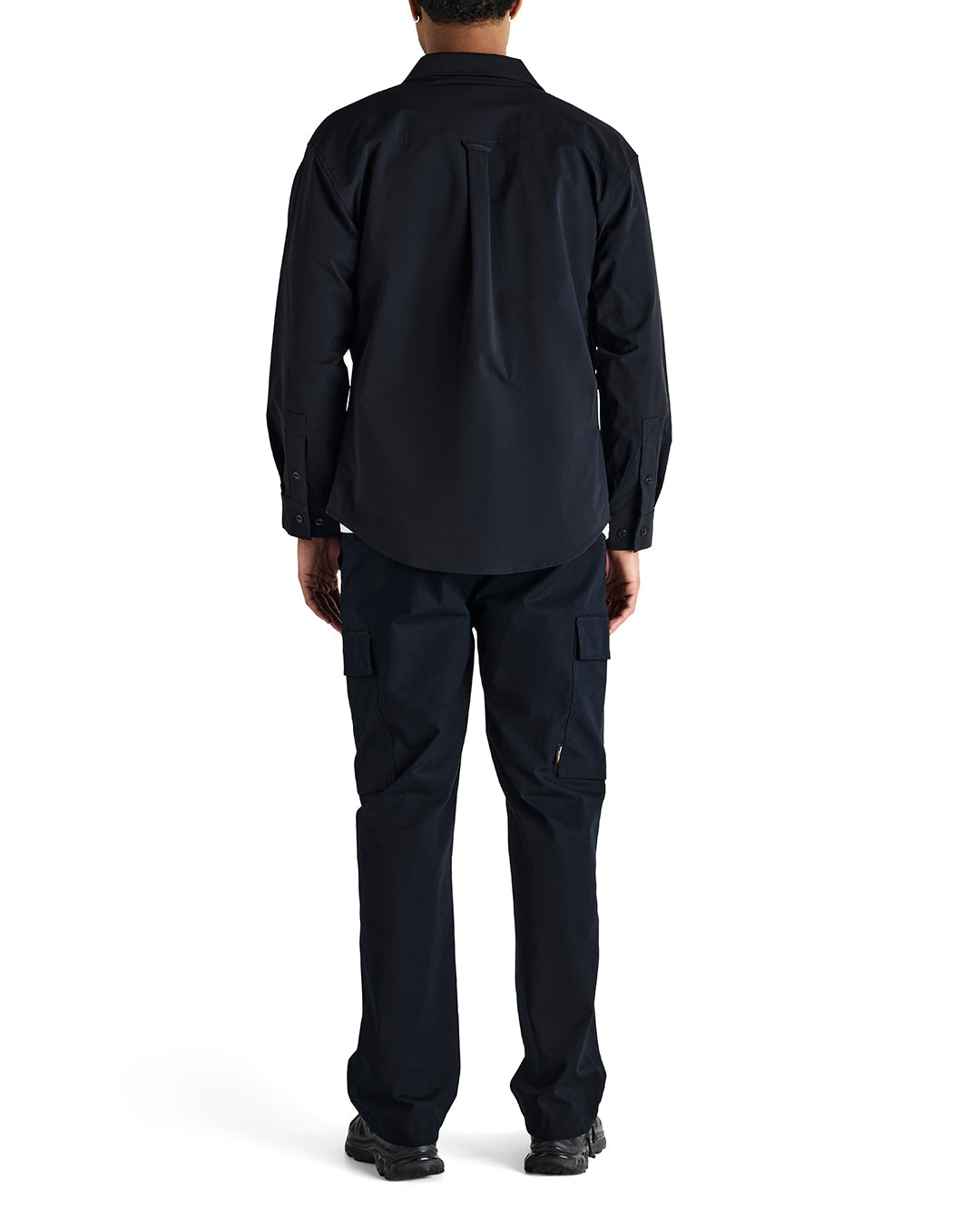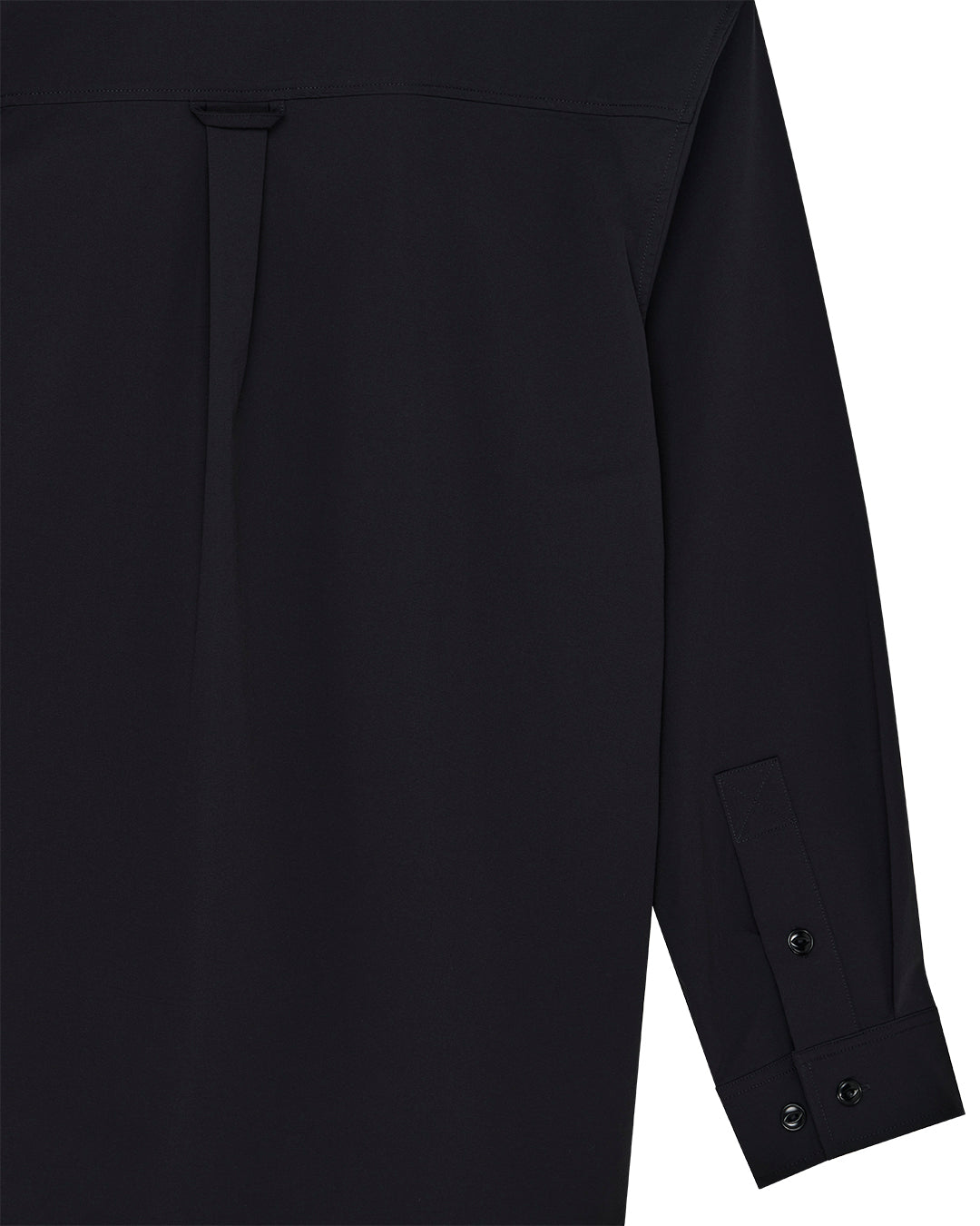 Relaxed fit long sleeve shirt with chest pocket branded label, chest patch pocket, corozo nut button front closure, in a nylon and elastane mix fabrication with a garment wash.