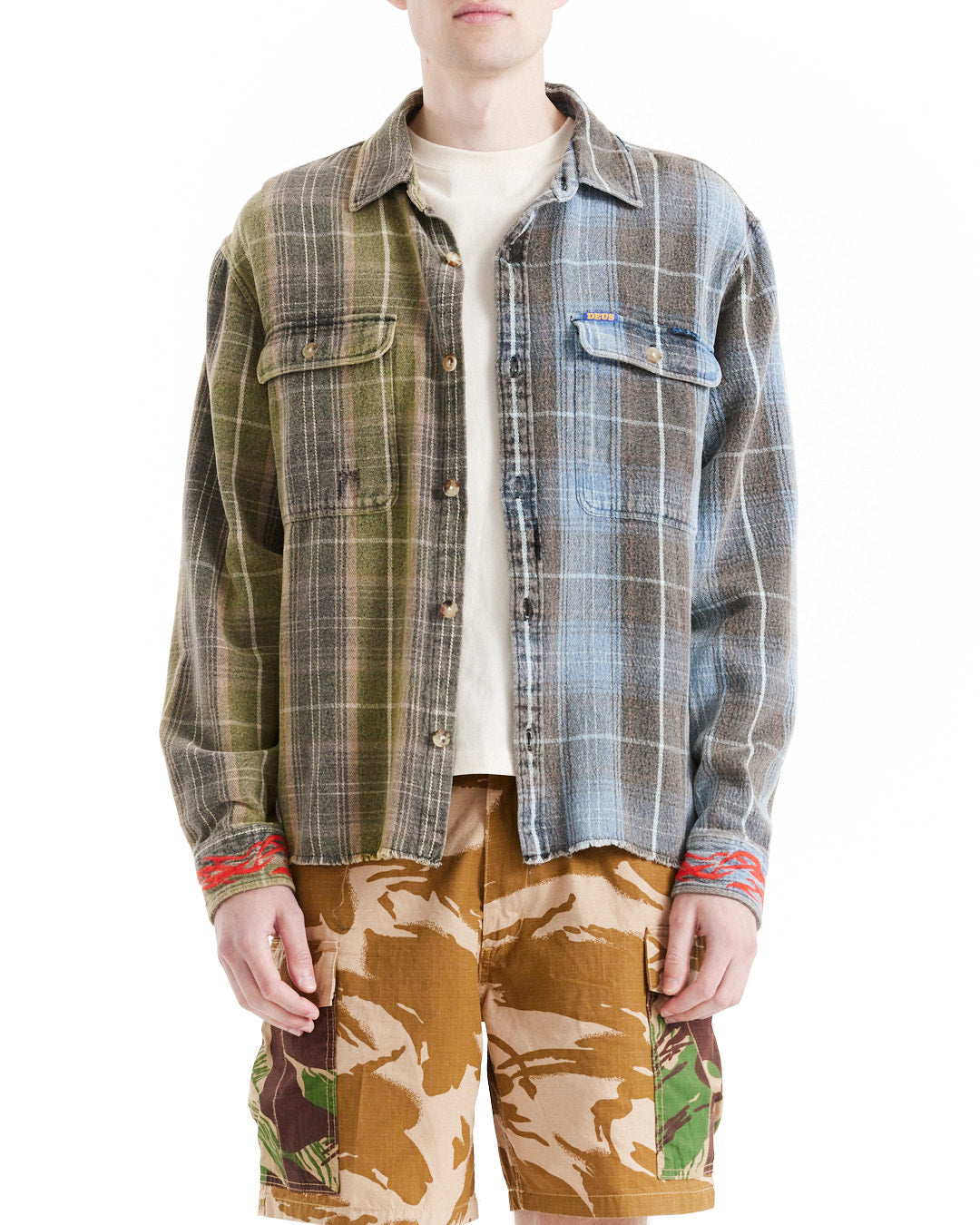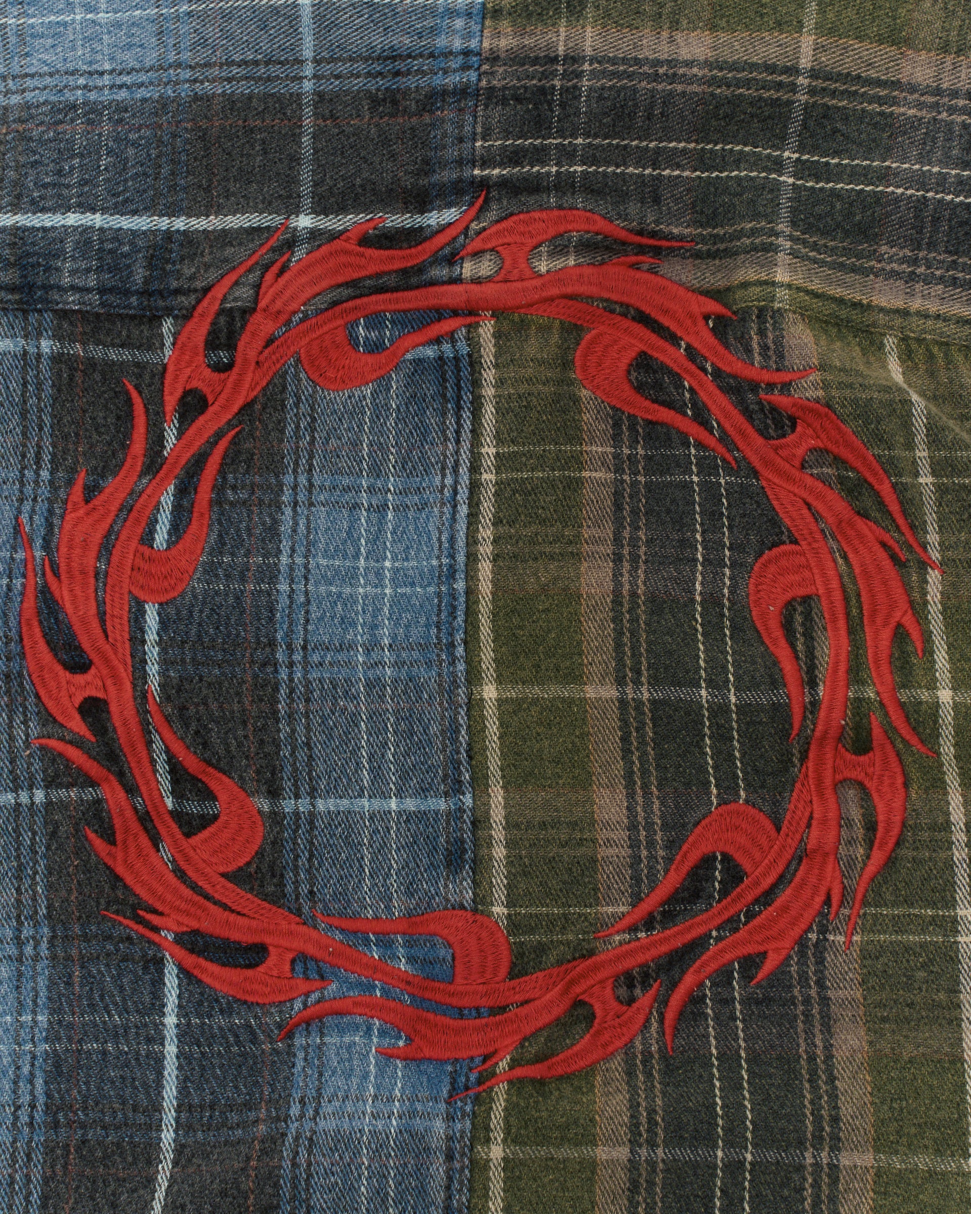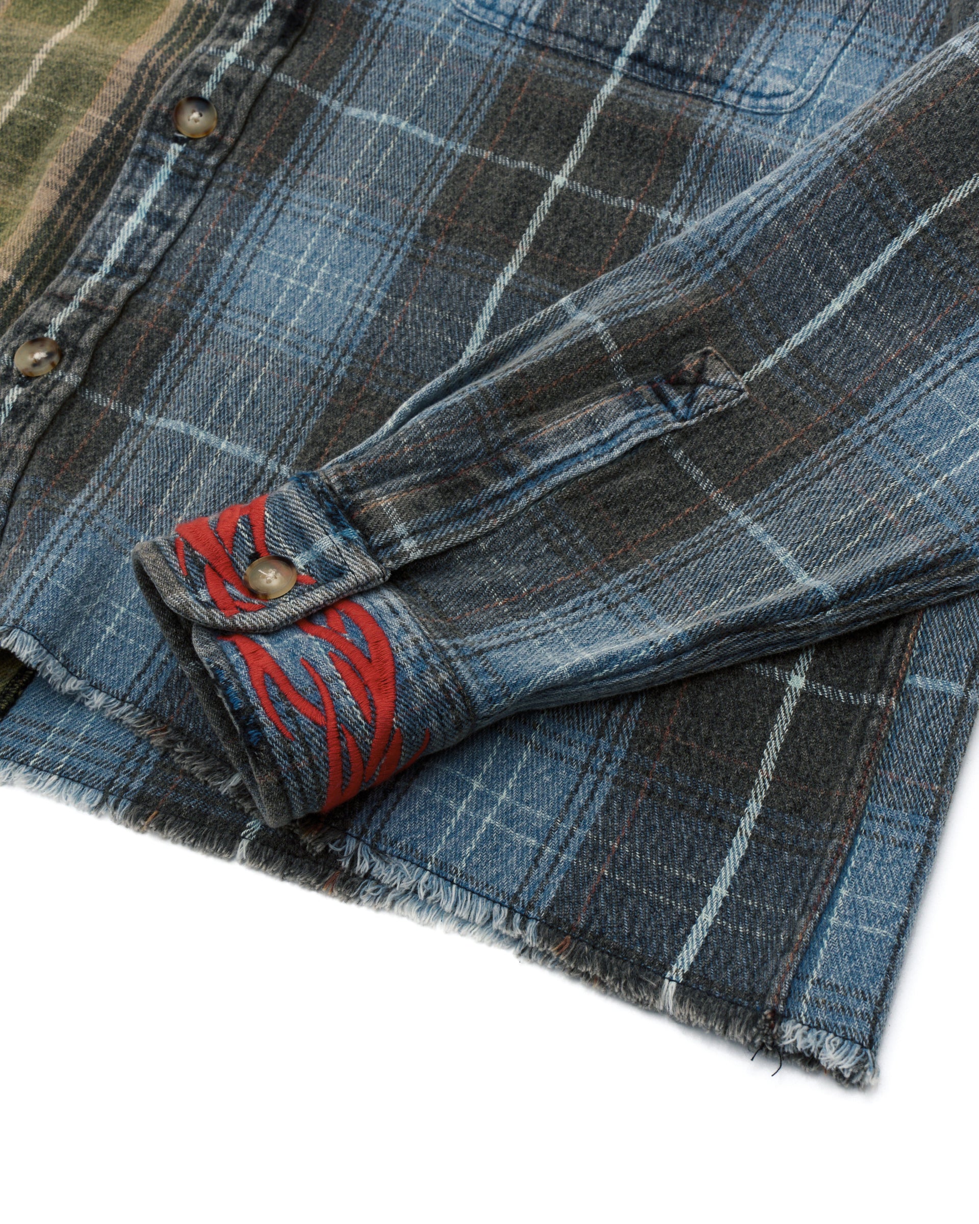 This patchwork flannel weaves together contrasting plaids in a harmonious balance of imperfection, while embroidery on the cuffs nods to a DIY heritage.