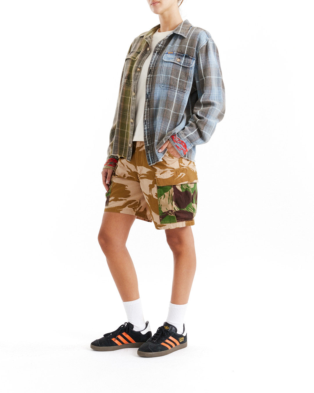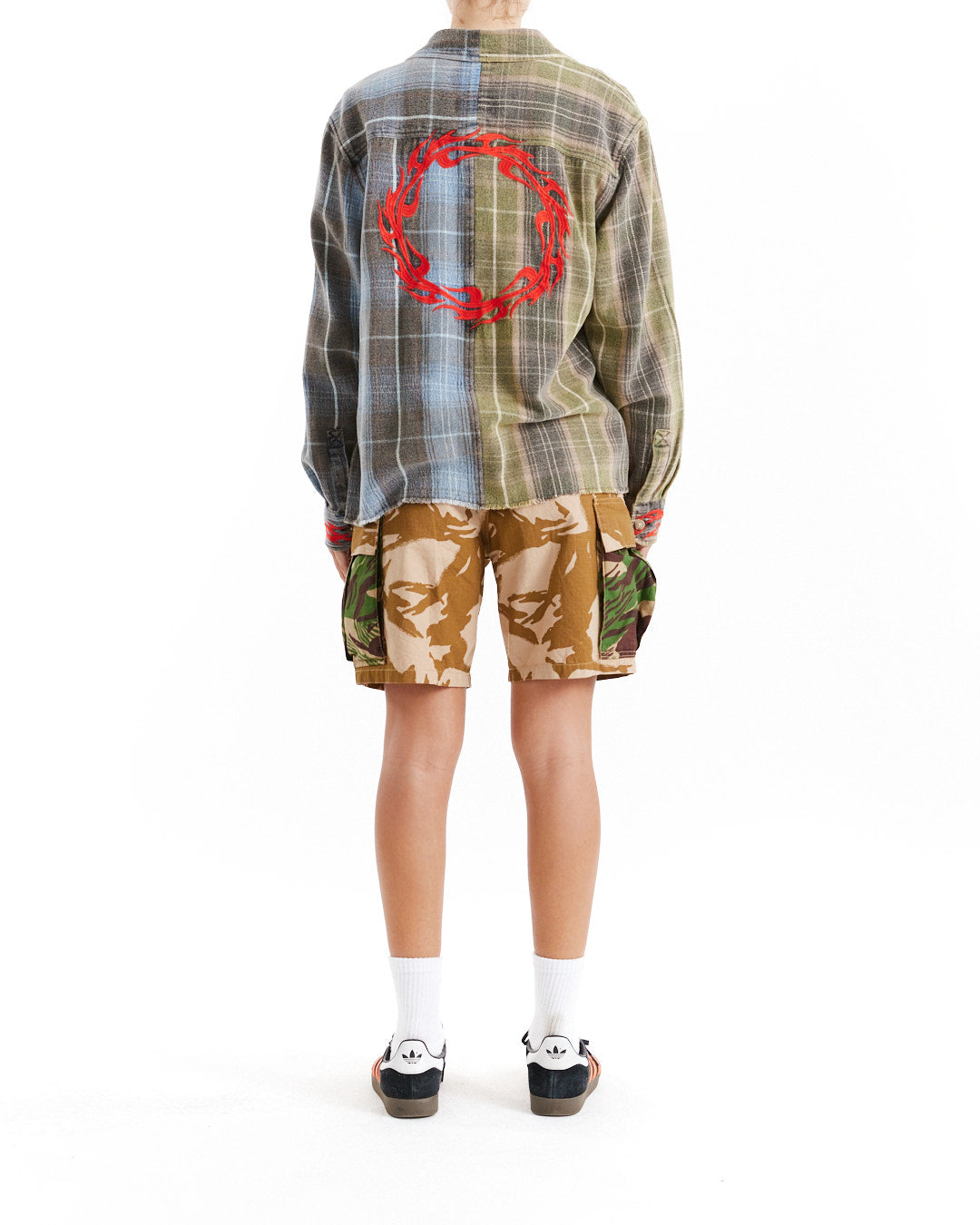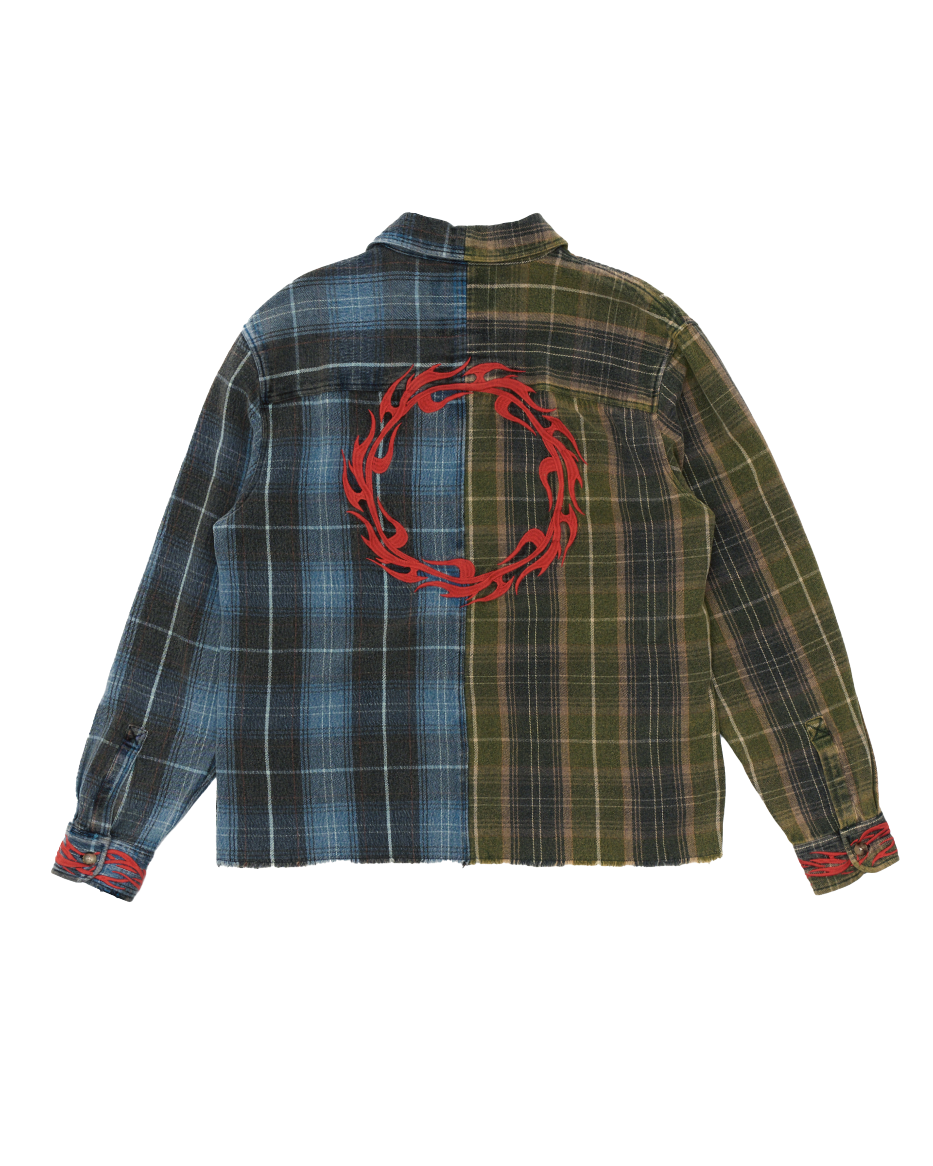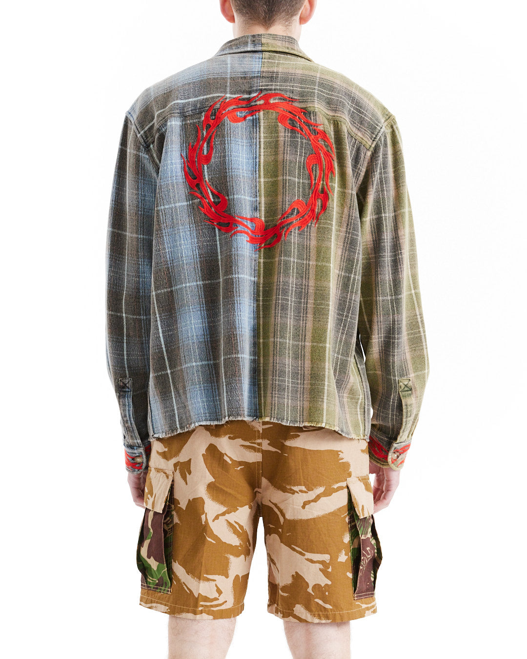 This patchwork flannel weaves together contrasting plaids in a harmonious balance of imperfection, while embroidery on the cuffs nods to a DIY heritage.