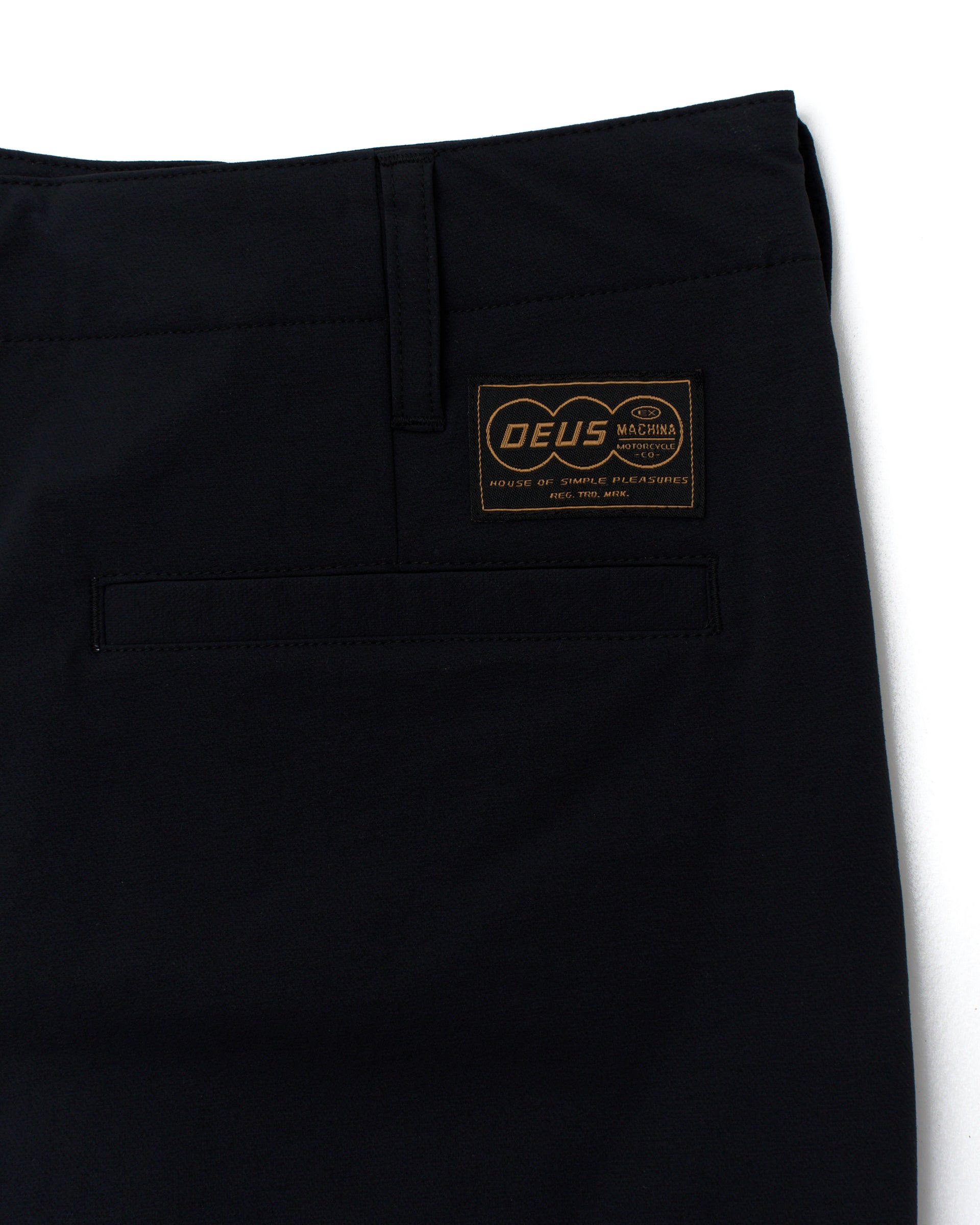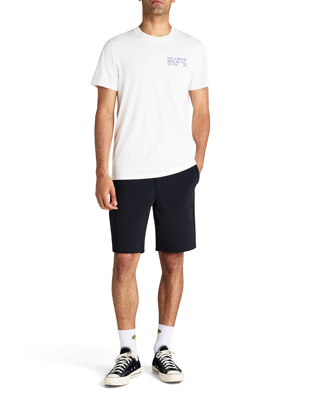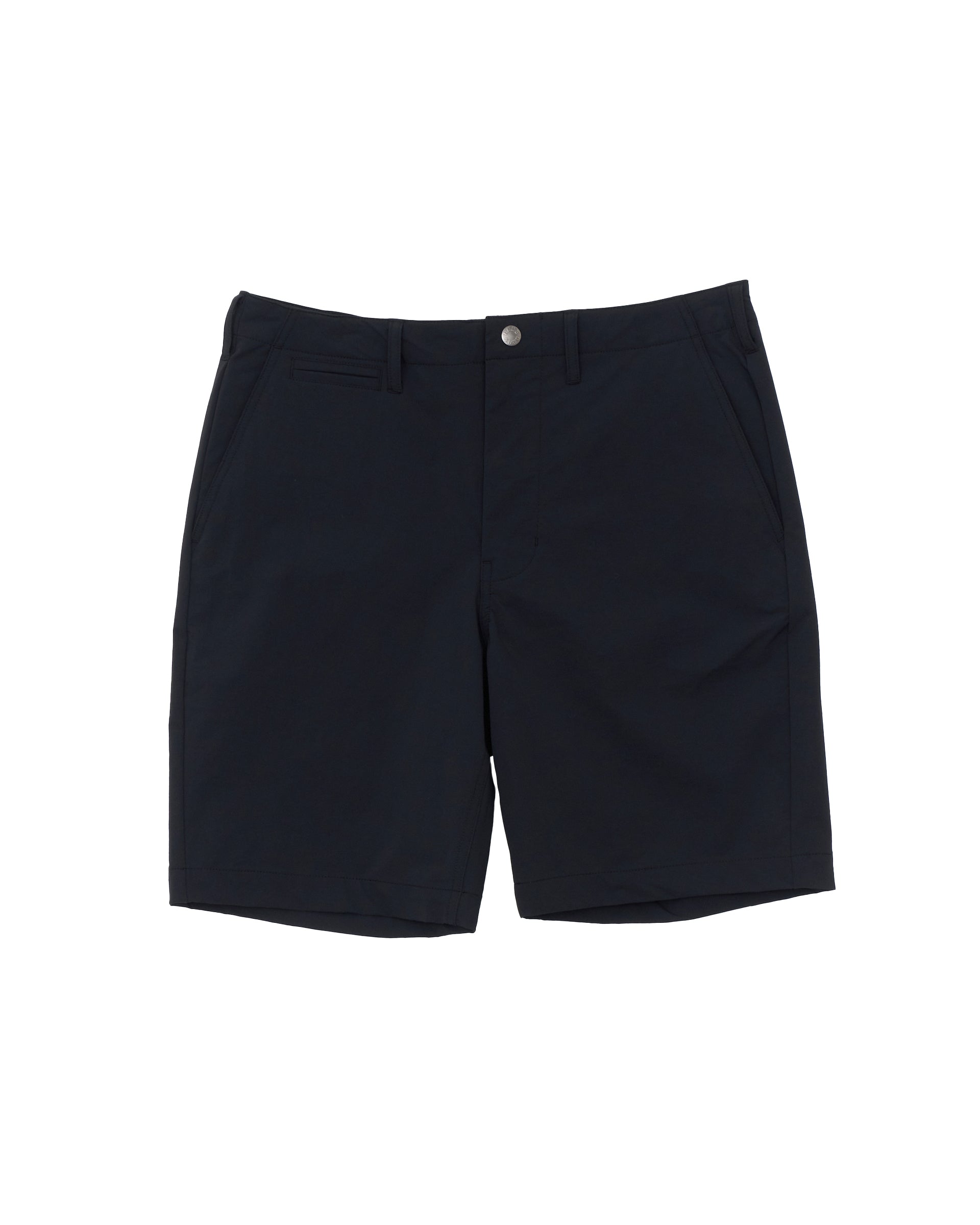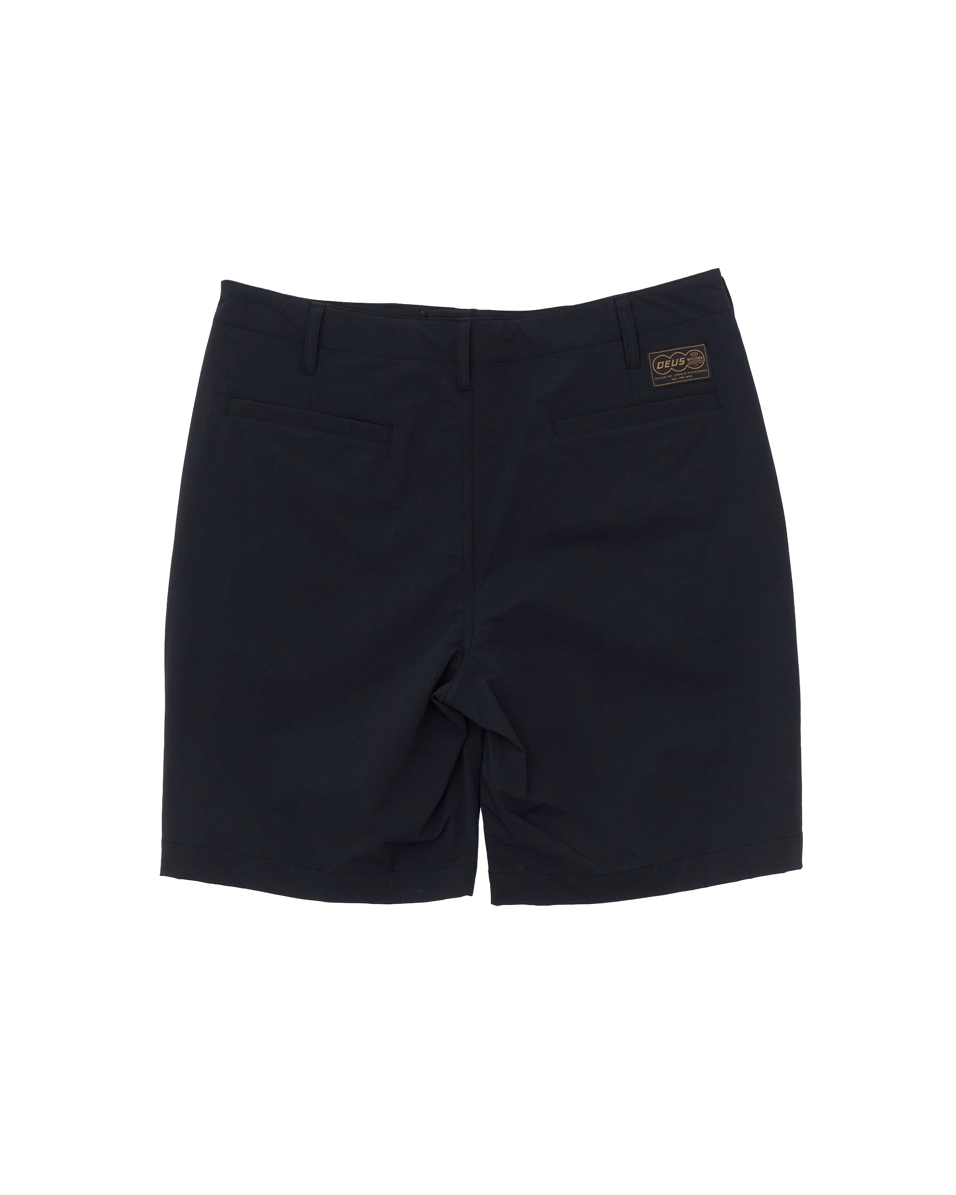 Relaxed fit short with branded label above back pocket, font slash and back welt pockets, branded snap front closure at waist, zip fly, in a nylon and elastane mix fabrication with a garment wash.