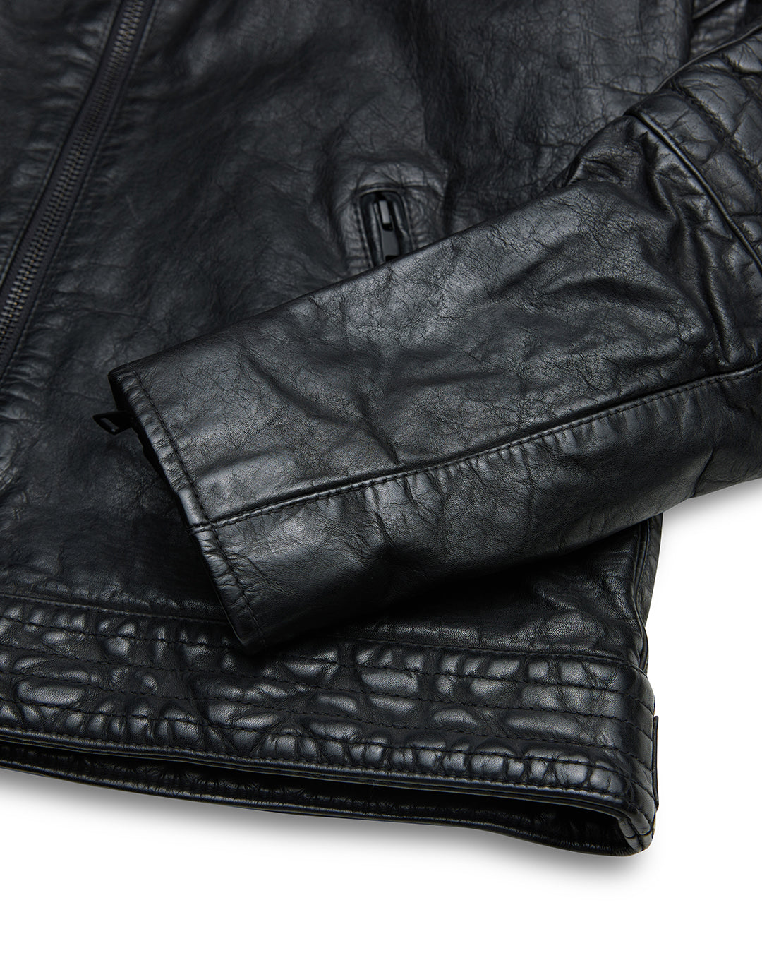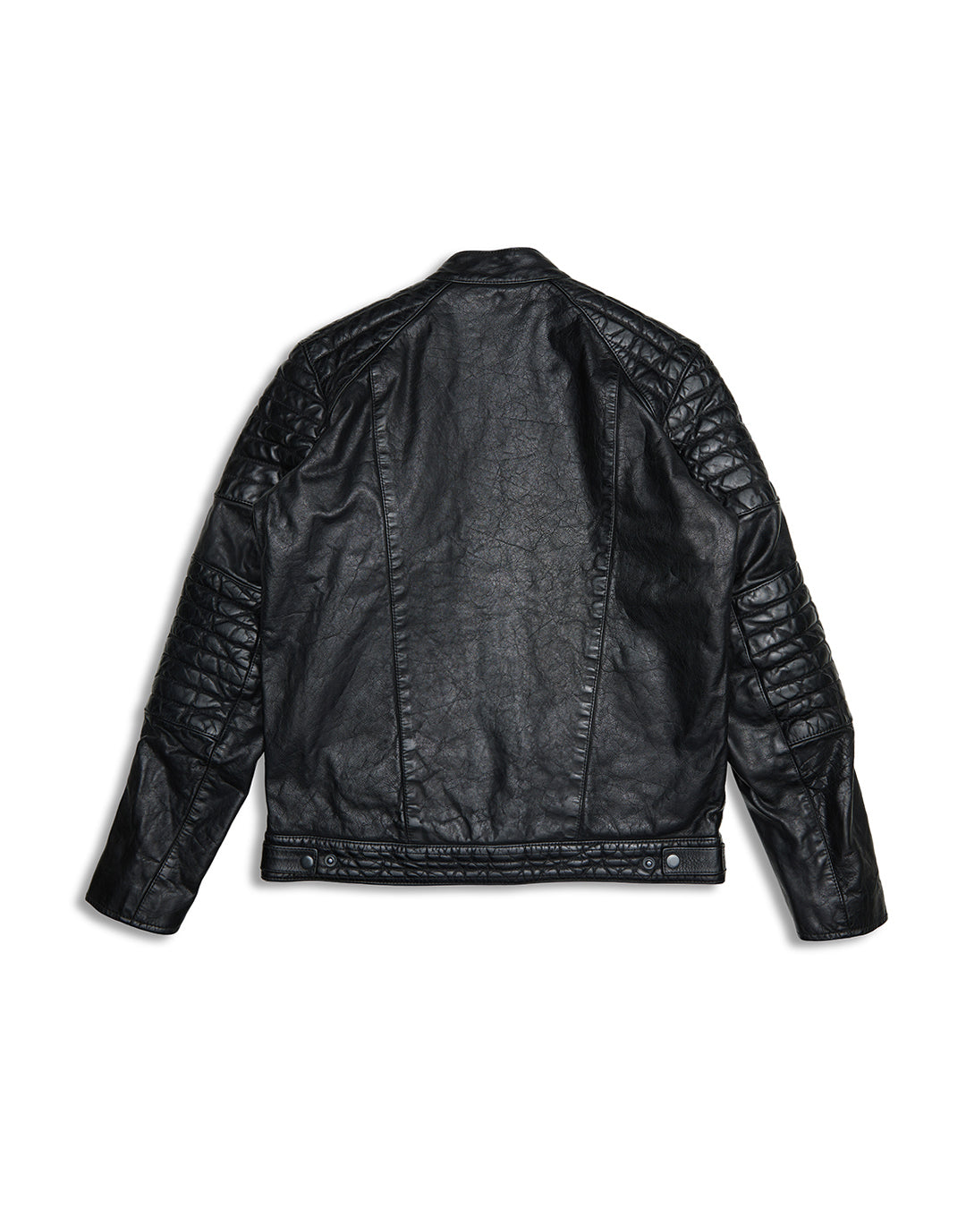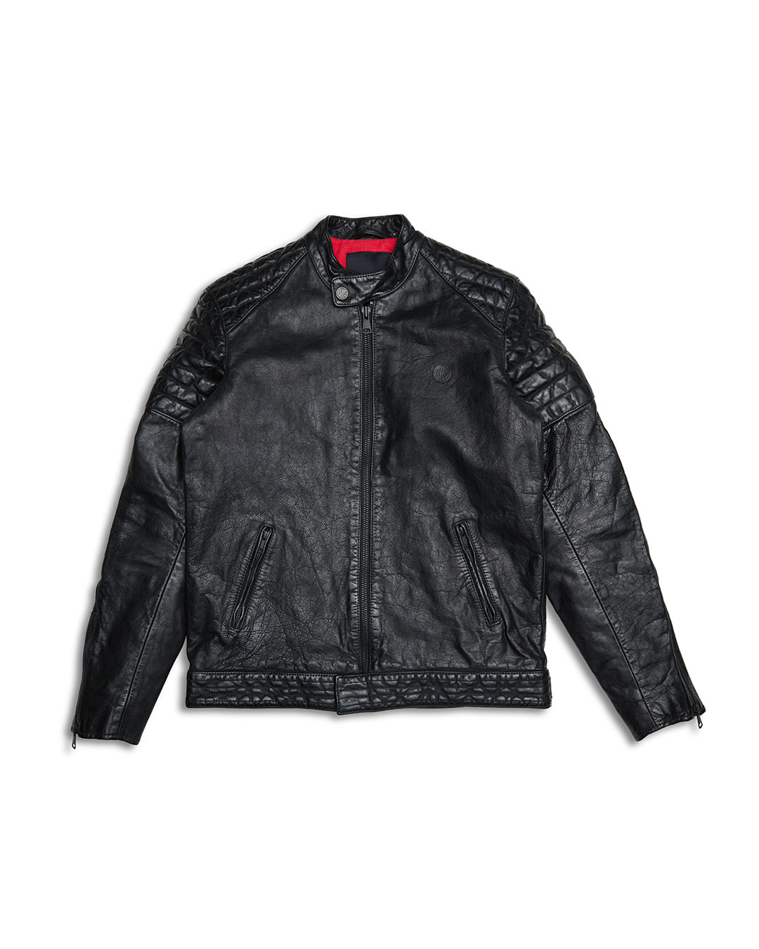 Regular Fit Leather Jacket Embossed Leather Branded Badge At Chest, Zip Front And Sleeve Closure, Lower Zip Pockets, Zip Quitted Protective Panelling At Shoulders, Back And Elbows, Snap Closure At Collar And Hem, In A Real Cow Leather Outer, Cotton Waffle Lining, Printed Polyester Sleeve Lining Design Fabrication With A Garment Wash