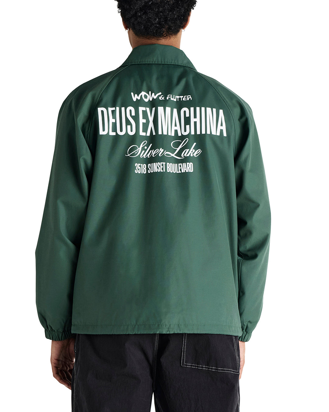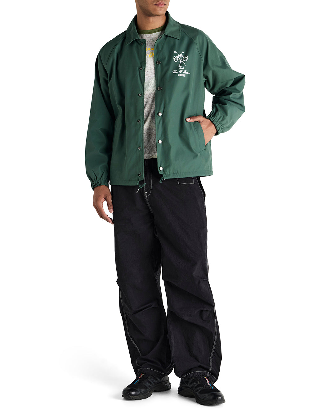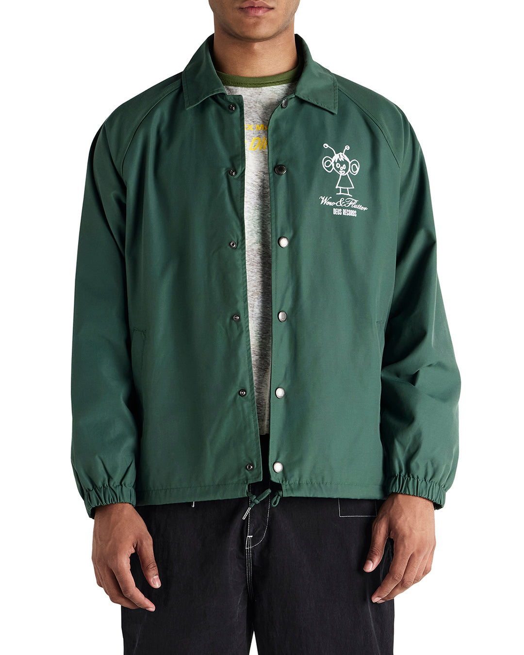 Relaxed fit coach jacket with front and back prints, branded press snap closure, drawstring at hem, front hem pockets, 57% cotton 43% nylon fabrication, padded polyester microfleece lining with a heavy enzyme stone wash.