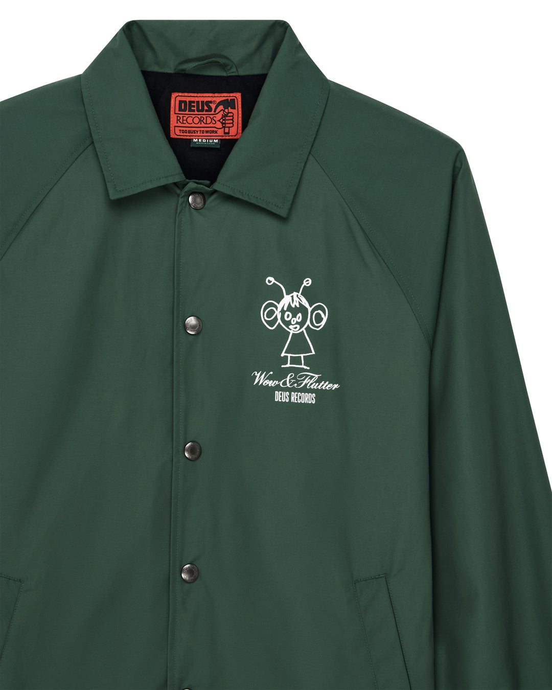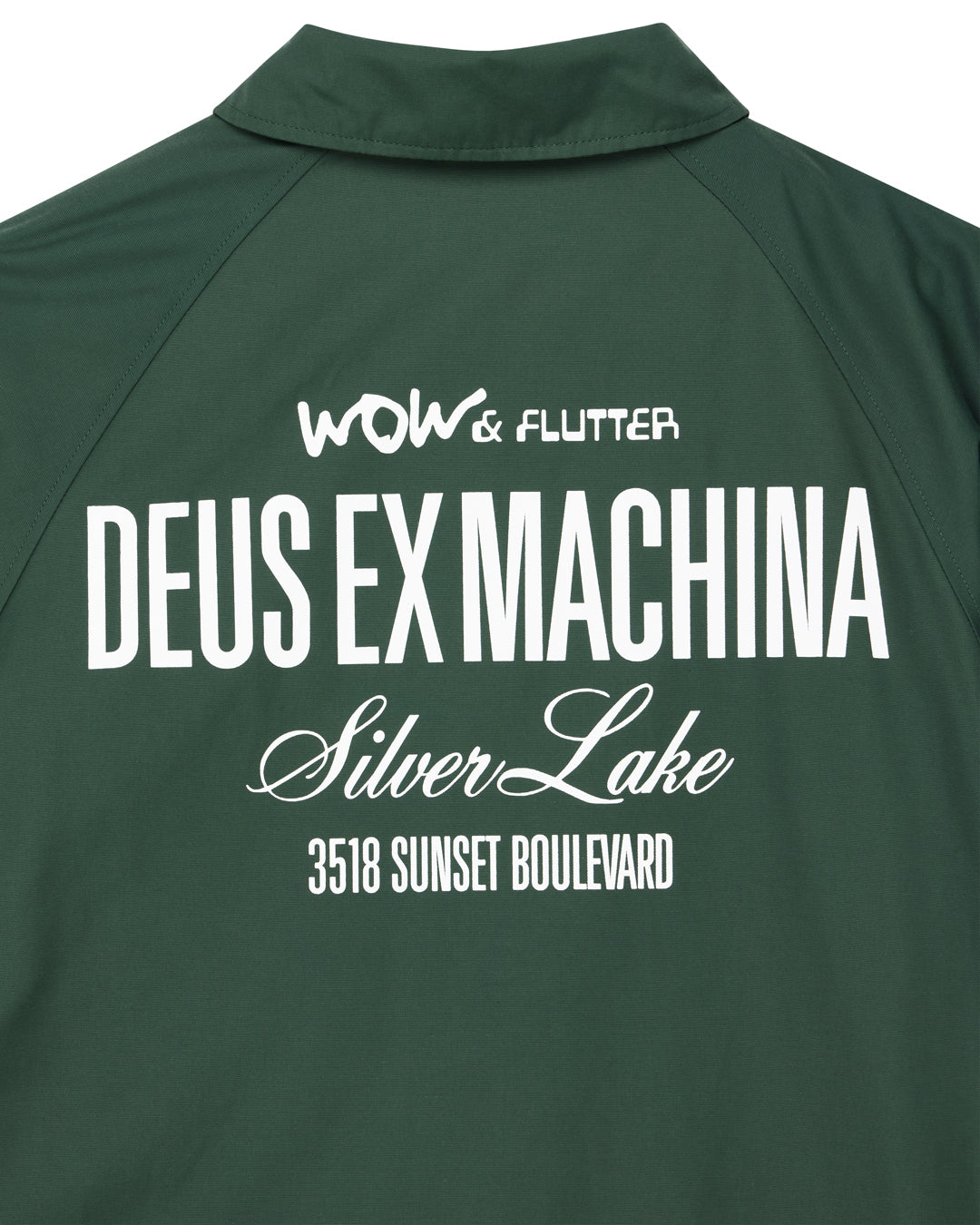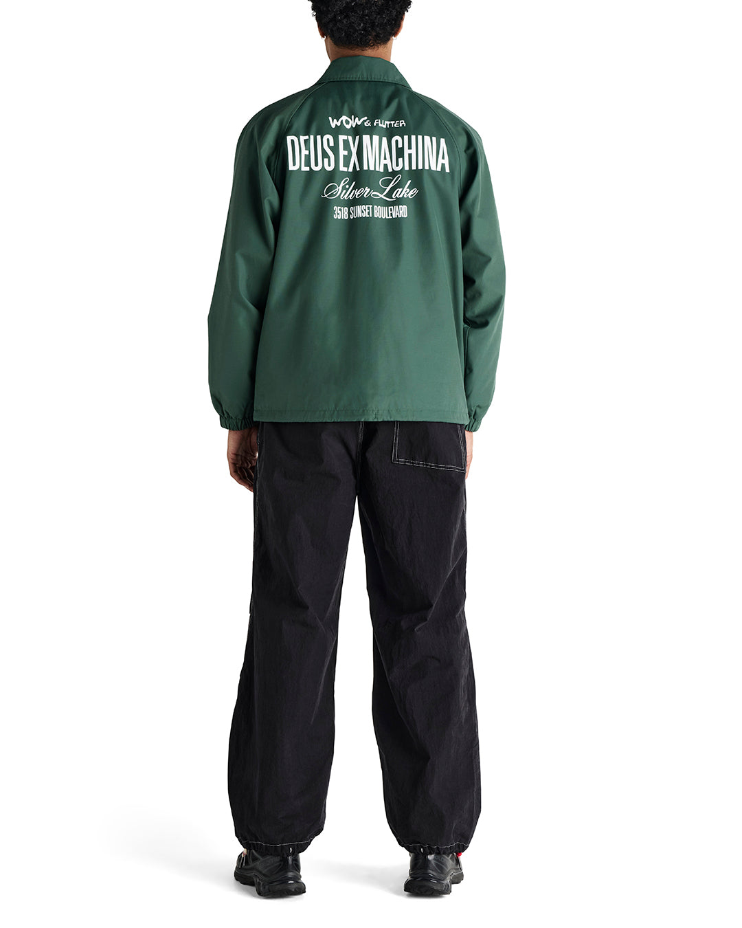 Relaxed fit coach jacket with front and back prints, branded press snap closure, drawstring at hem, front hem pockets, 57% cotton 43% nylon fabrication, padded polyester microfleece lining with a heavy enzyme stone wash.