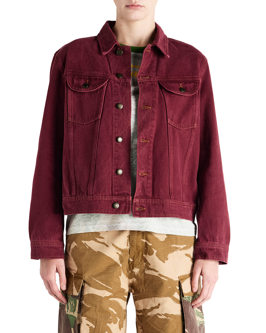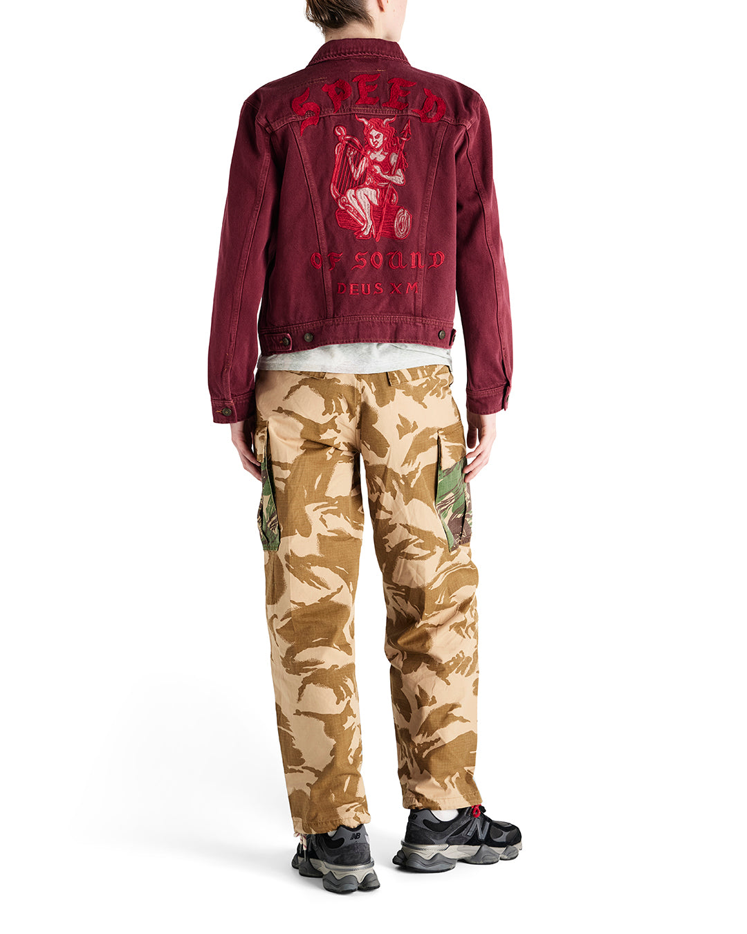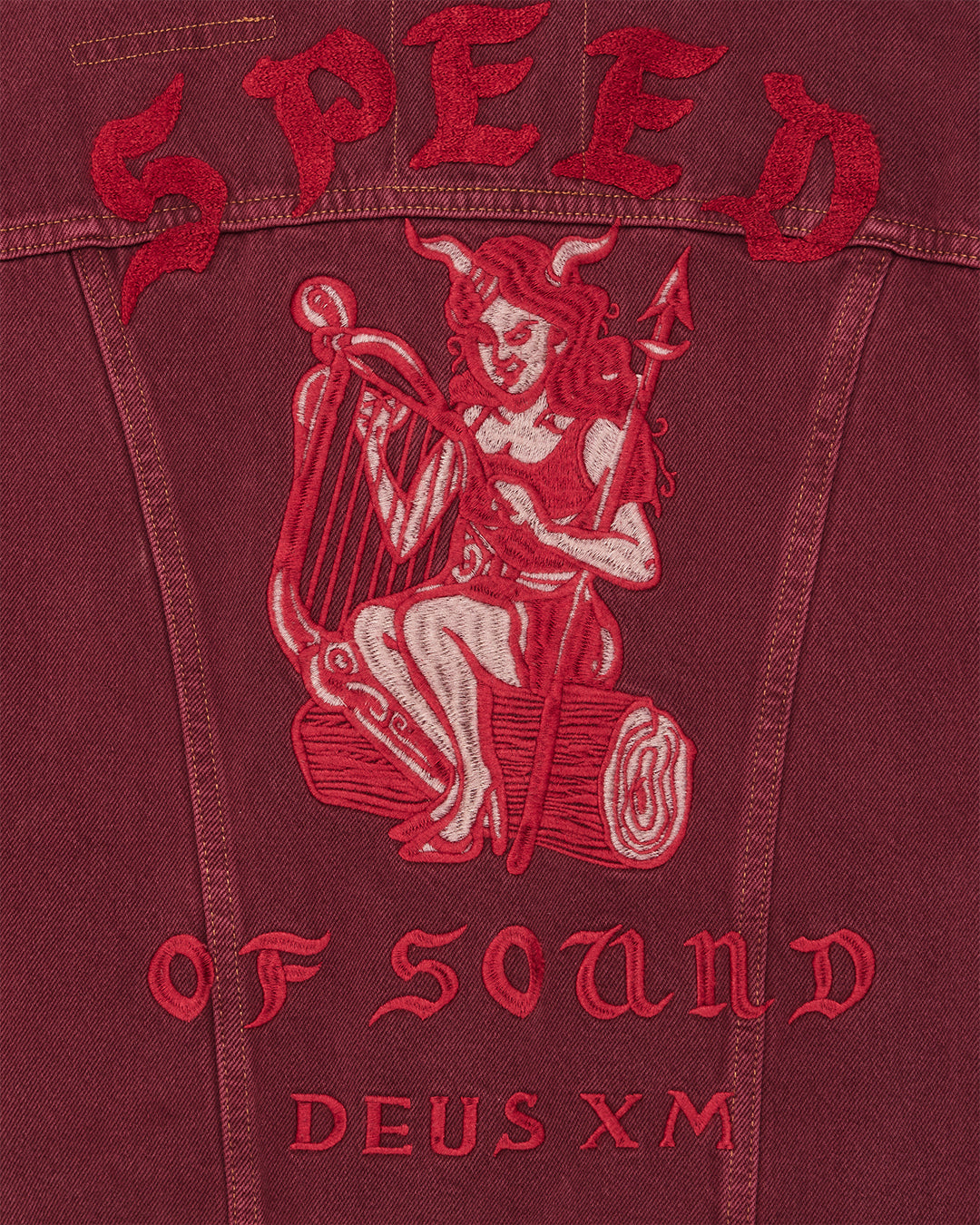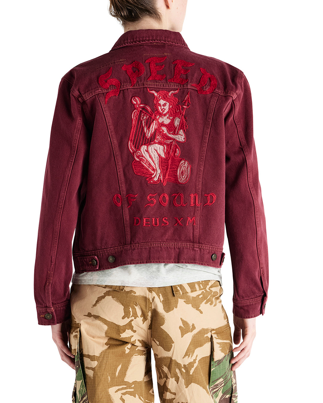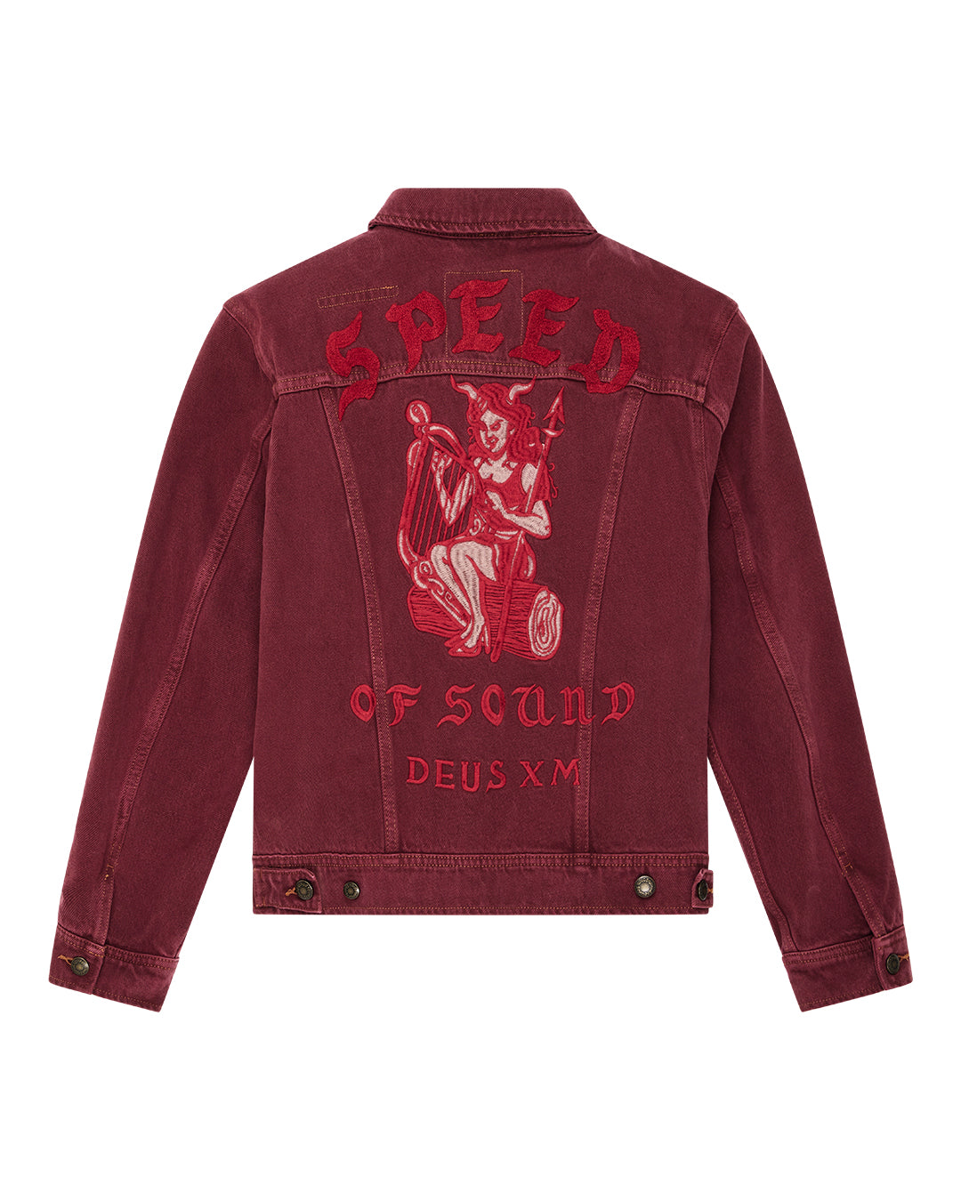 This relaxed fit denim trucker comes ready-made with whimsically sinister back embroidery and a vintage inspired, heavy enzyme stone wash.