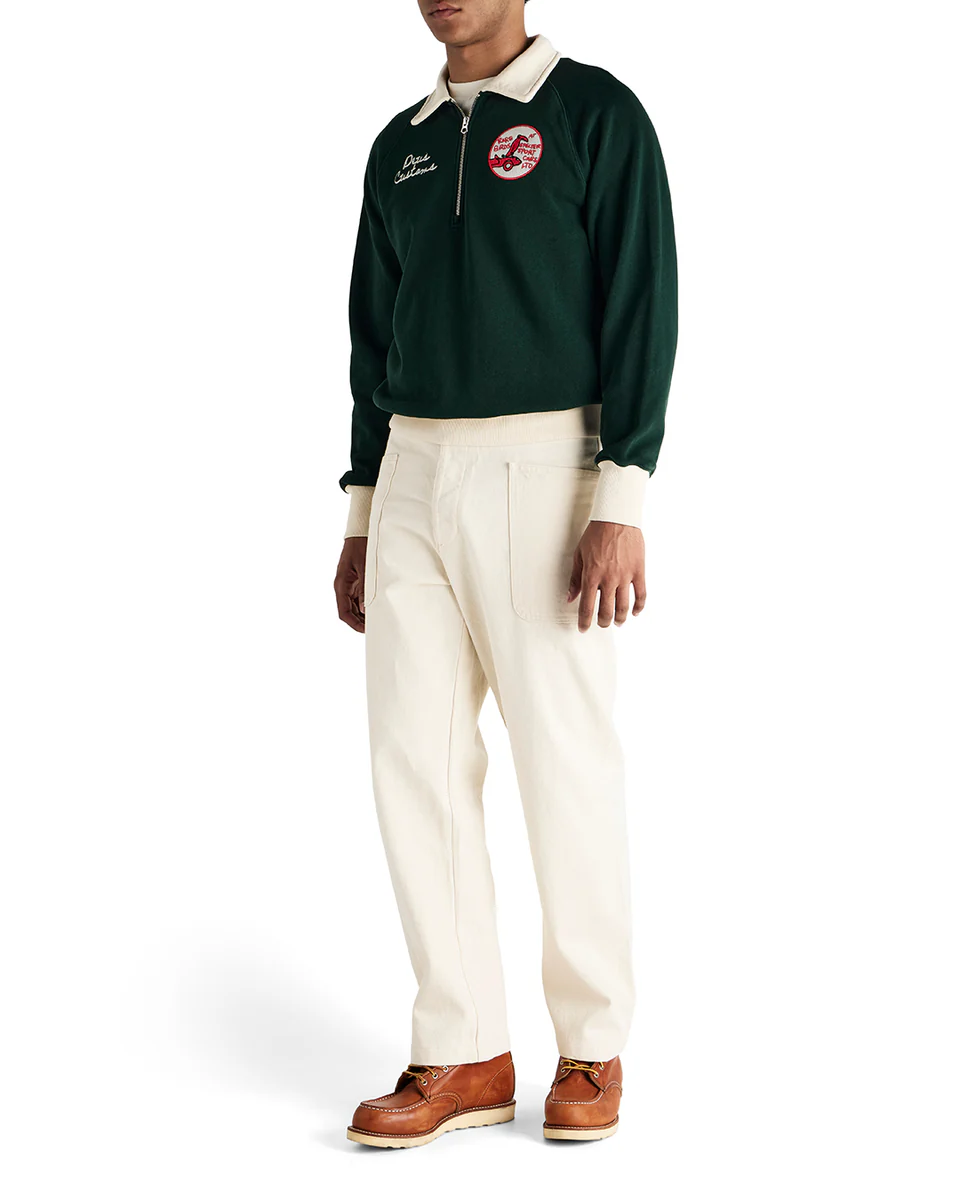 Regular Fit Tubular Knit Zip Neck Fleece With Front Embroidered And Patch Art, Collar With Zip Neck Closure In An Organic Cotton Fleece Fabrication With A Heavy Garment Wash.