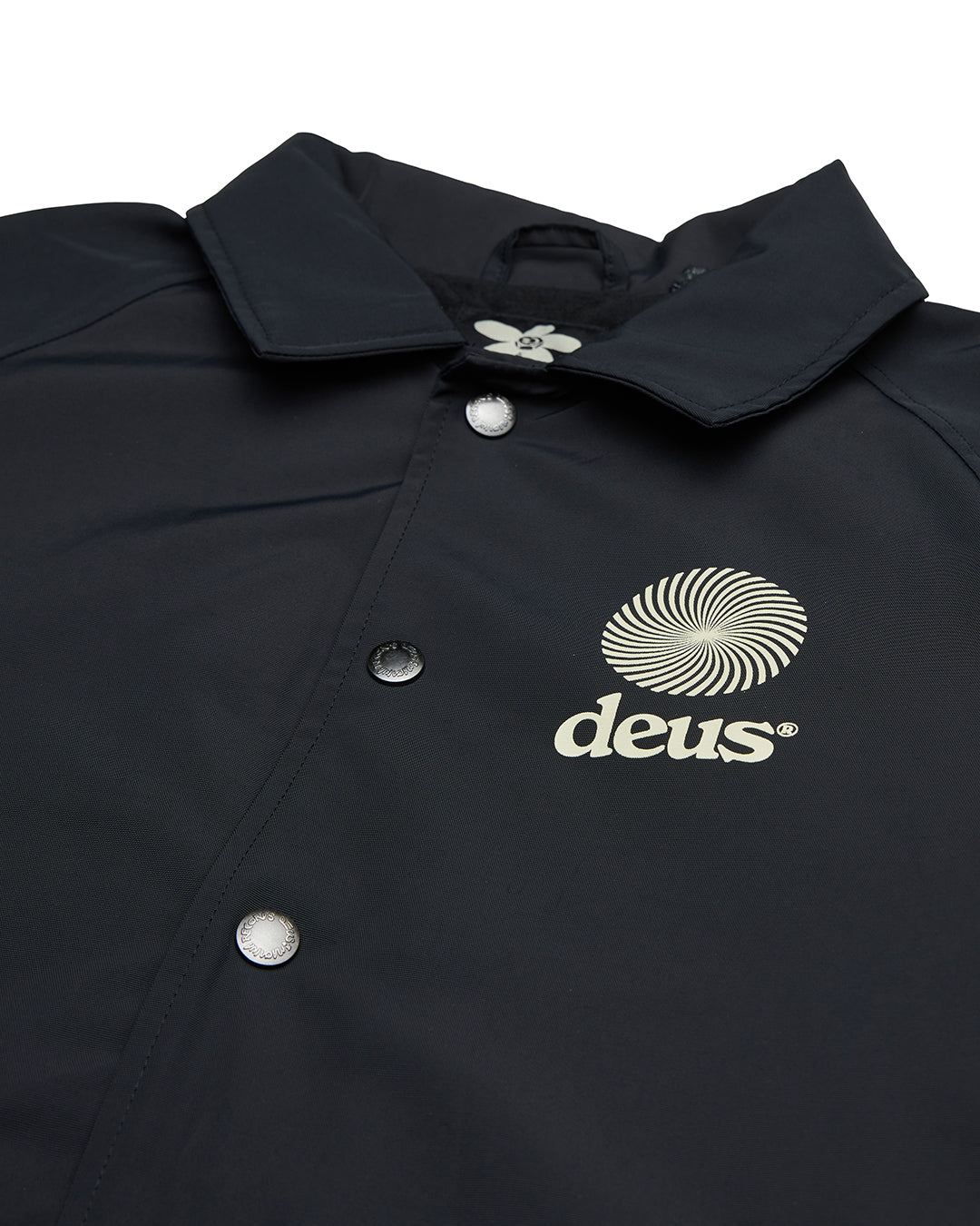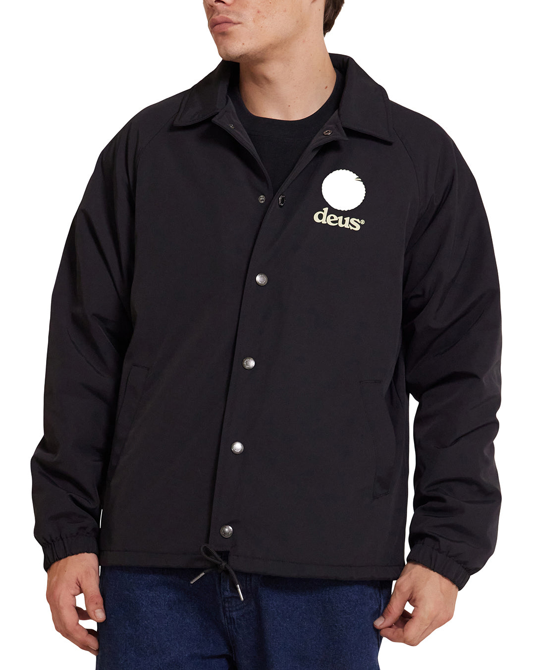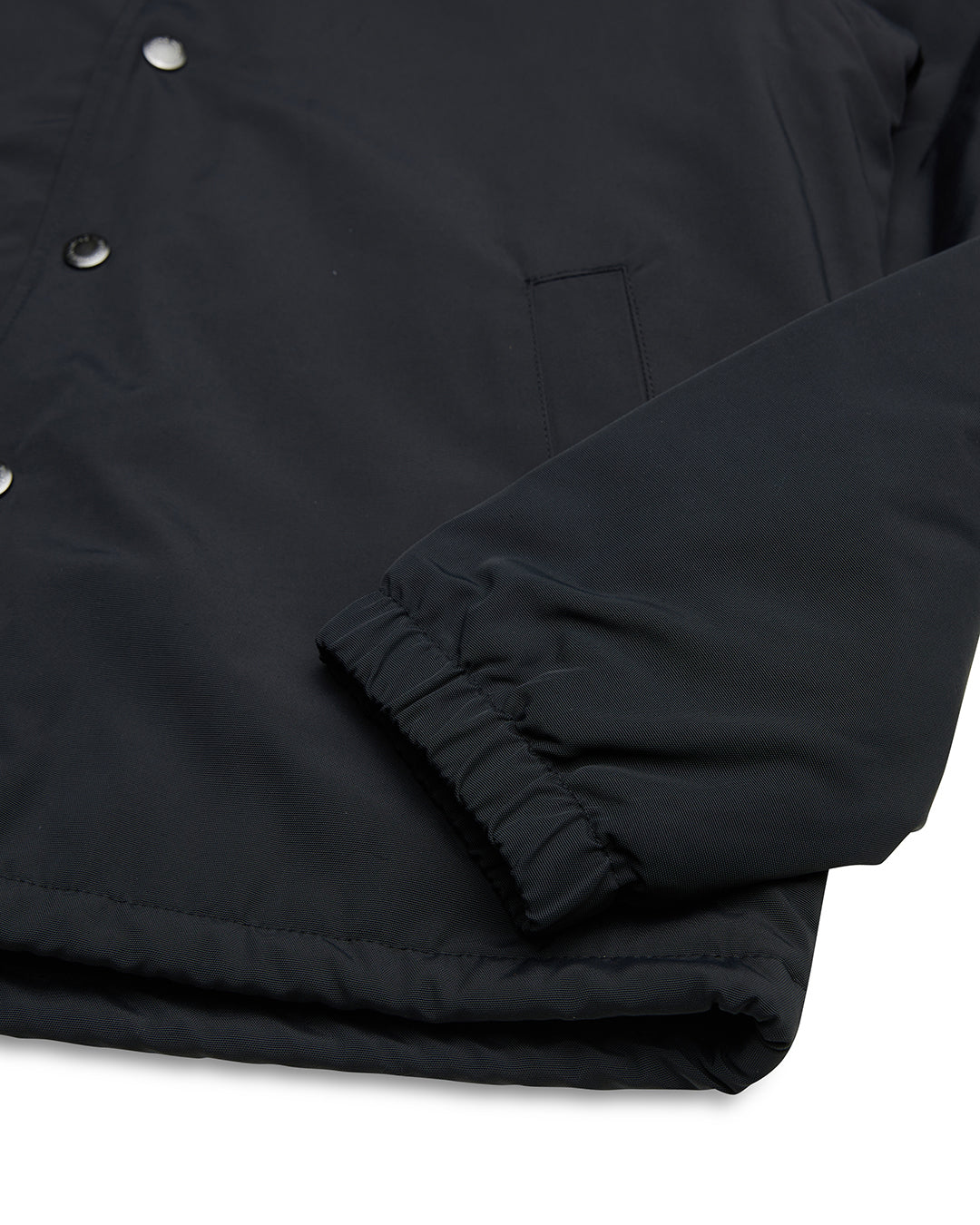 Relaxed fit coach jacket with front and back prints, branded press snap closure, drawstring at hem, front welt pockets, cotton and nylon mix outer shell, polyester micro fleece lining fabrication with a garment wash.