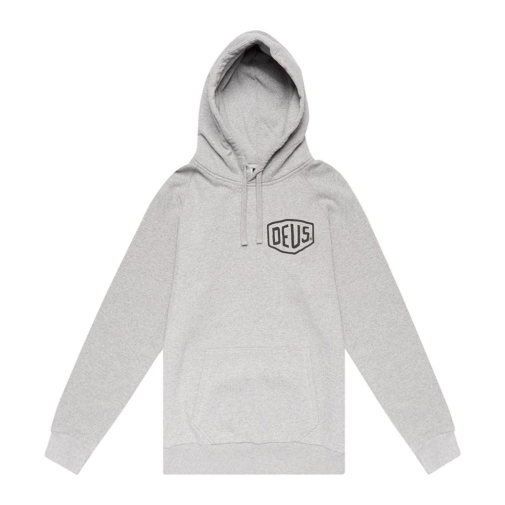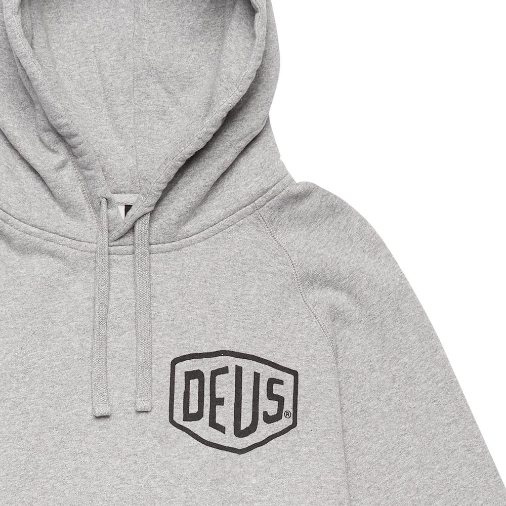 A standard fit pullover hoodie with the Deus Shield on the front and Tokyo Address print on the back, made from 32/2s + 12/1s 350gm cotton brushed-back fleece.