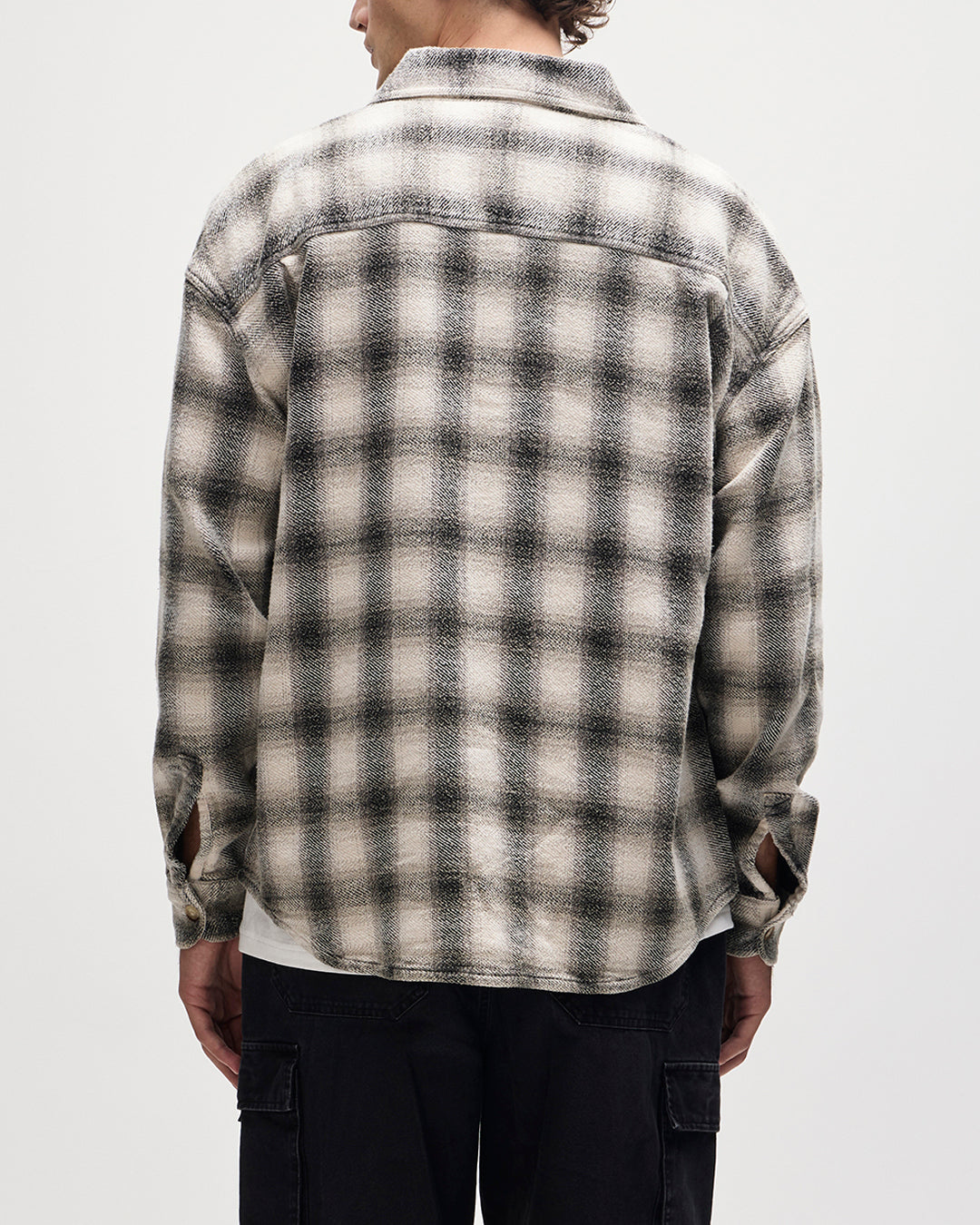 - Brushed cotton yarn dyed check fabrication with a heavy garment wash