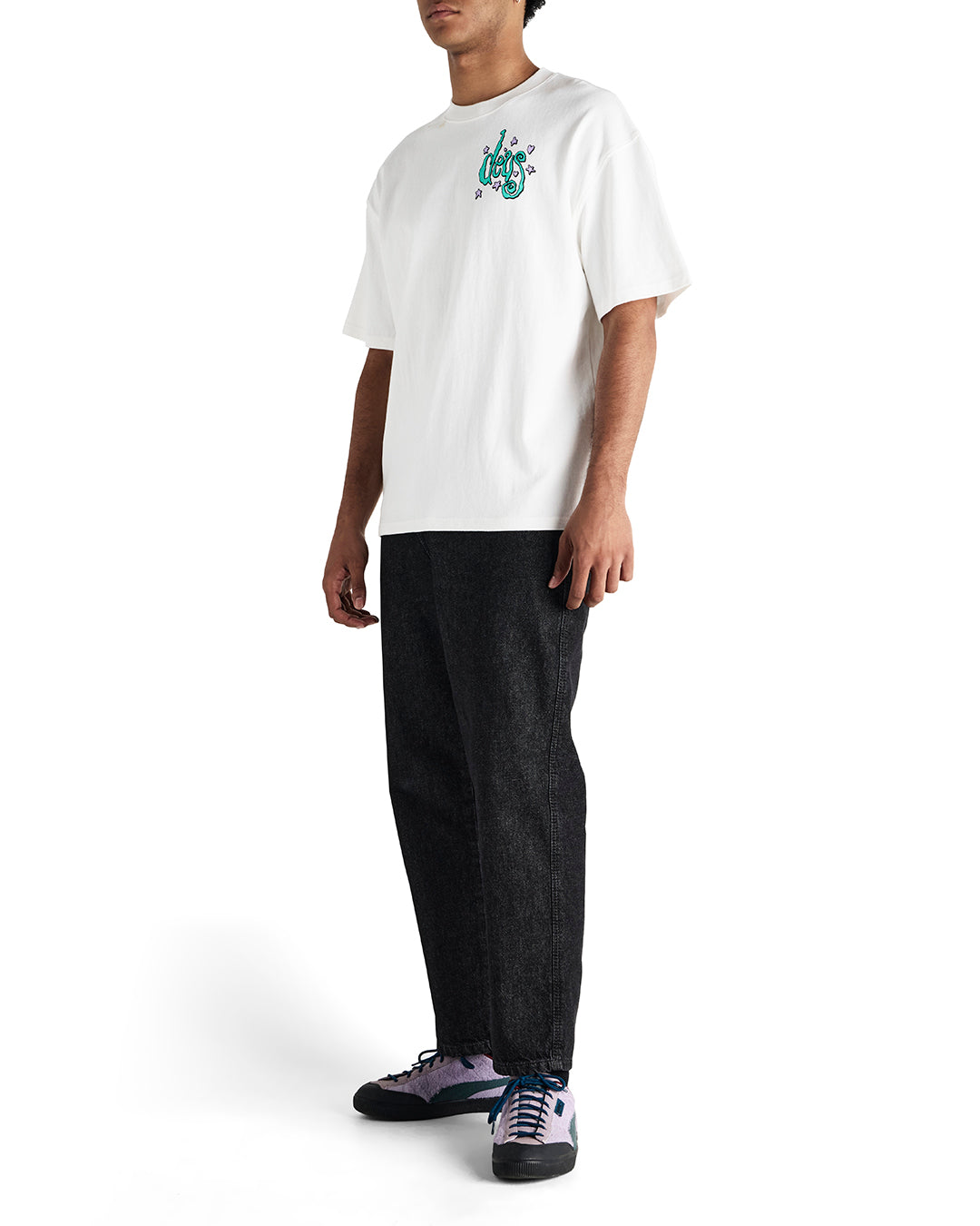 Oversized fit short sleeve tee with printed chest and back art, recycled cotton rugby jersey fabrication with a heavy enzyme stone wash